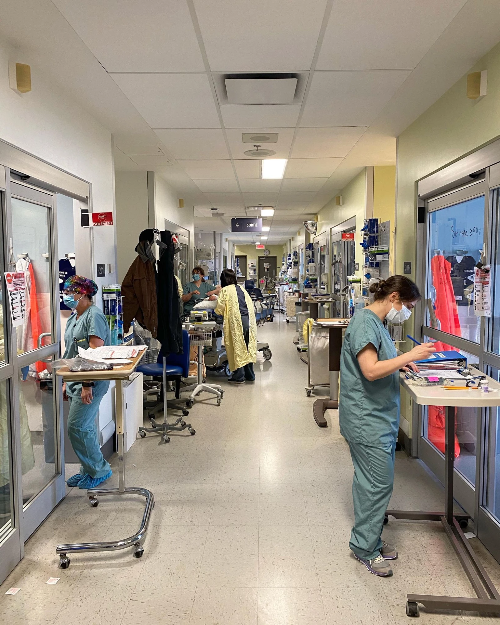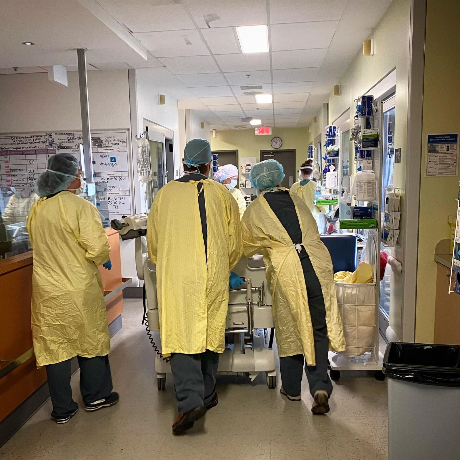 Plusieurs infirmiers/ères en sarrau jaune font irruption dans le couloir sur un pied d’alerte, transportant un nouveau patient. Ce dernier a l’air jeune, mais ce n’est pas la COVID qui l’amène ici, me dit-on.