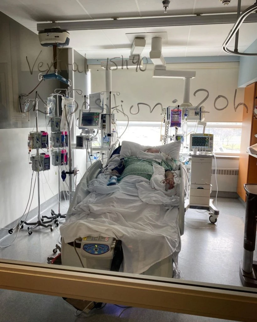 Quelques informations et consignes à son sujet sont écrites sur la vitrine à l’intention du personnel soignant. On indique notamment la durée de sa position ventrale, qui consiste à retourner le patient sur le ventre. « Avant la COVID, on avait fait ça à quelques reprises seulement, maintenant on le fait 4-5 fois par jour. Les poumons respirent mieux ainsi. Certains patients peuvent passer 16h sur le ventre, on réussit à en sauver pas mal », souligne l’infirmier en chef.