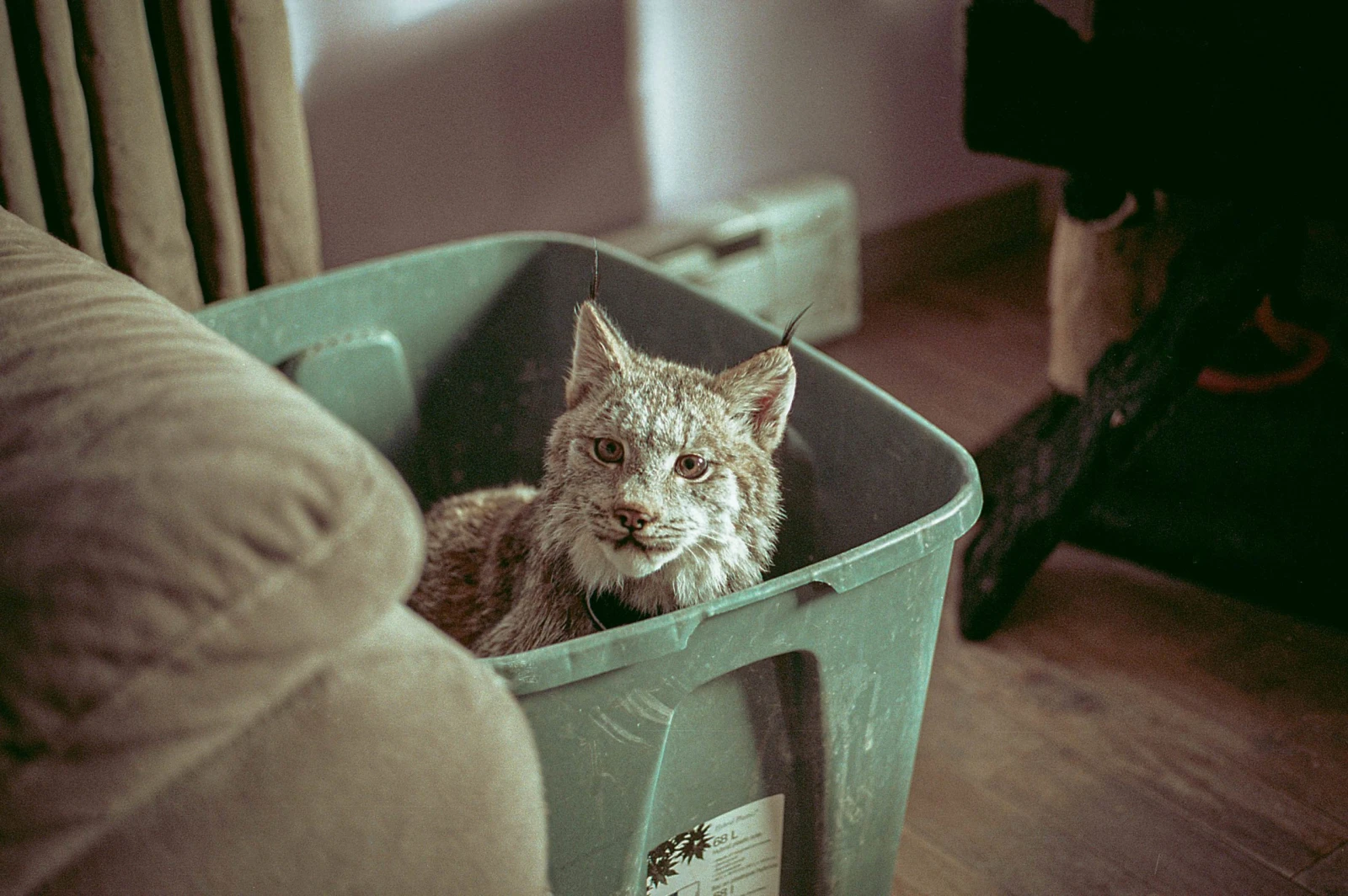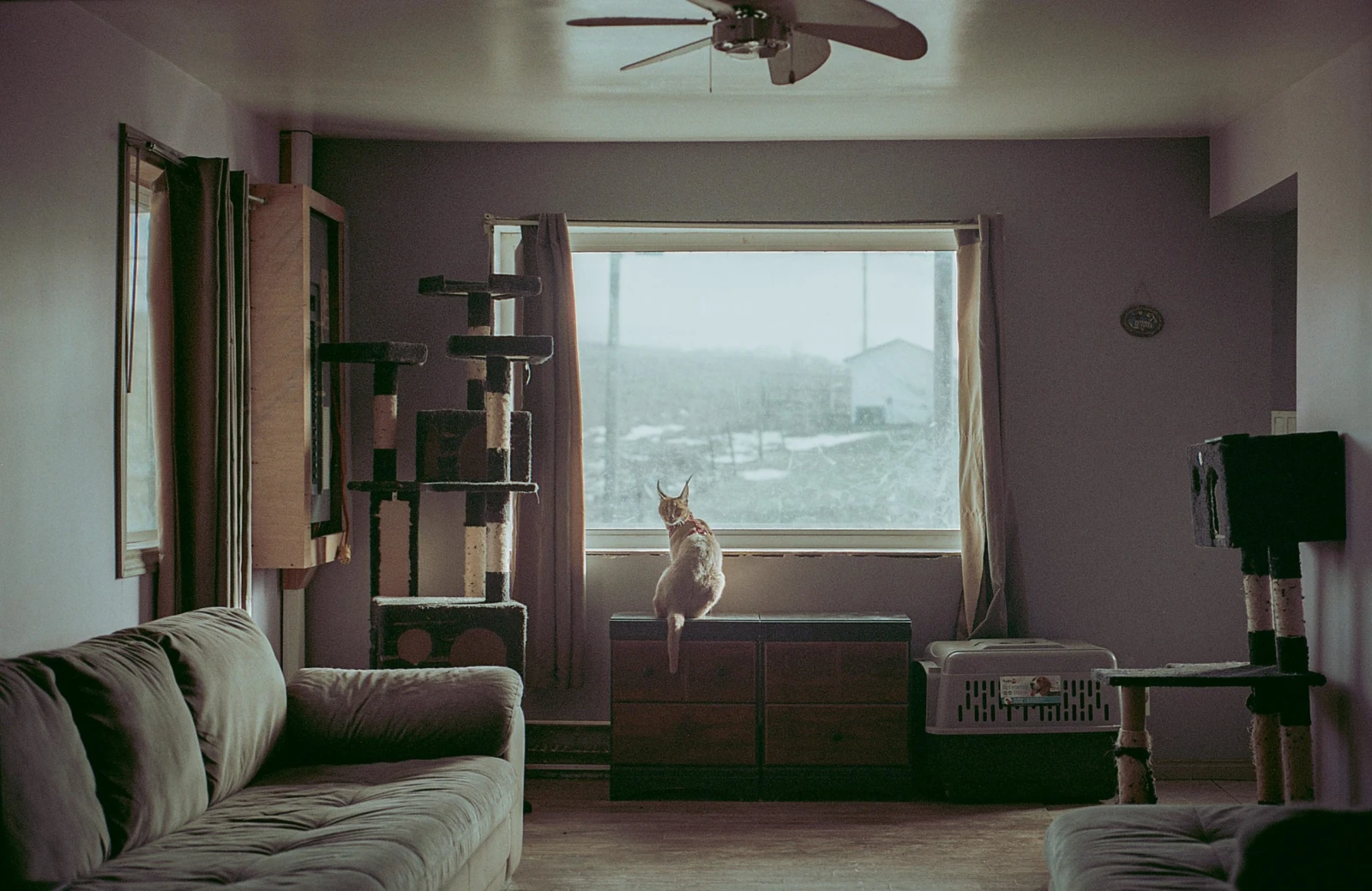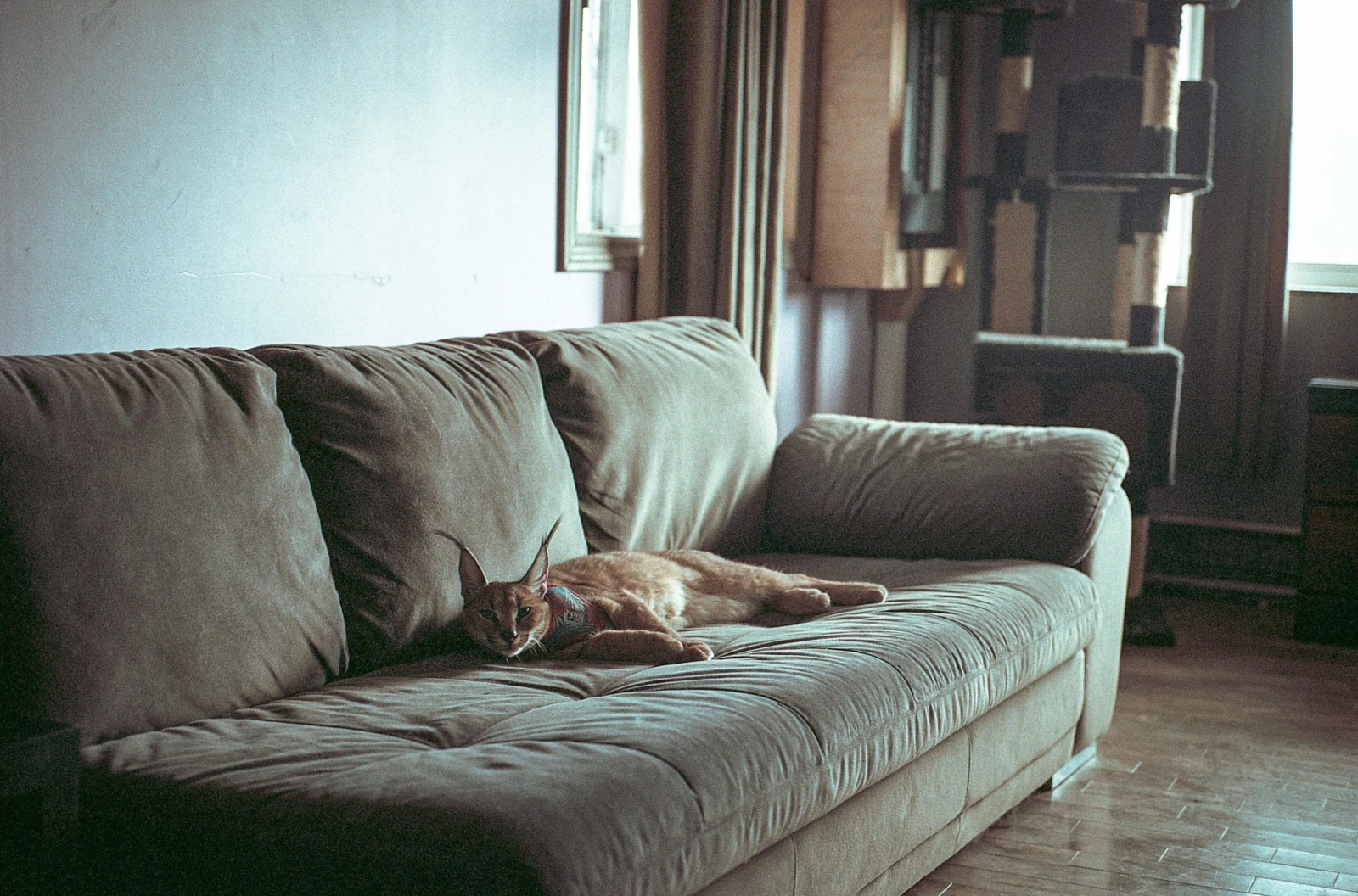 Joël m’ouvre et j’entre dans une grande pièce presque vide, si ce n’est que quelques meubles et des monticules destinés aux félins. Sur le divan repose une espèce de petit cougar aux oreilles pointues. « C’est un caracal. Elle est très gentille. N’ait pas peur », avise mon hôte en voyant mes pas ralentir.