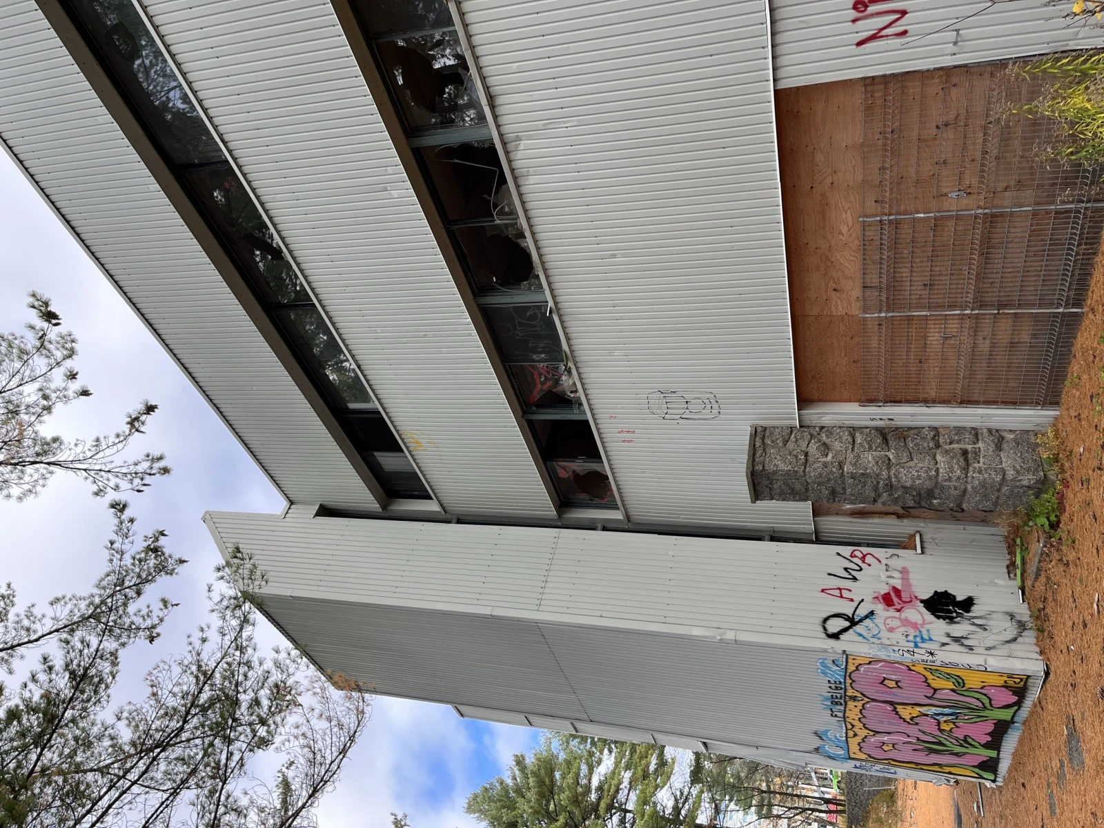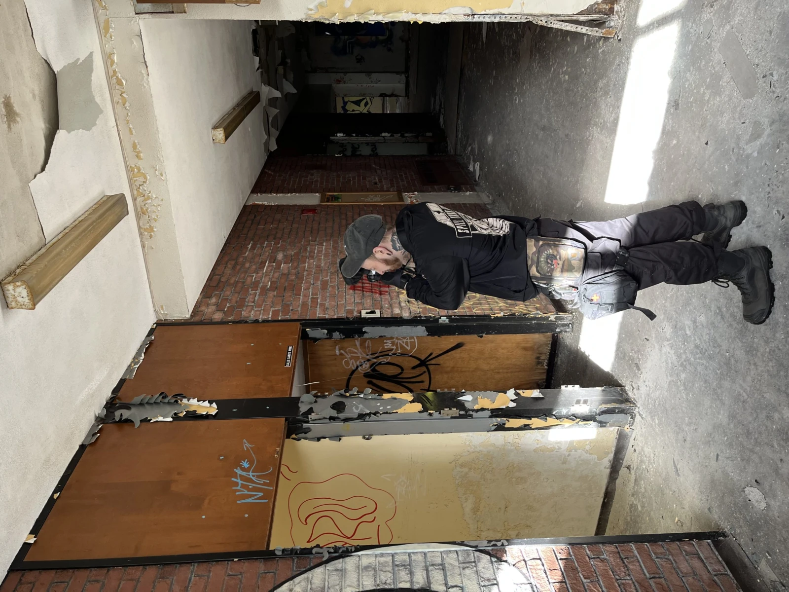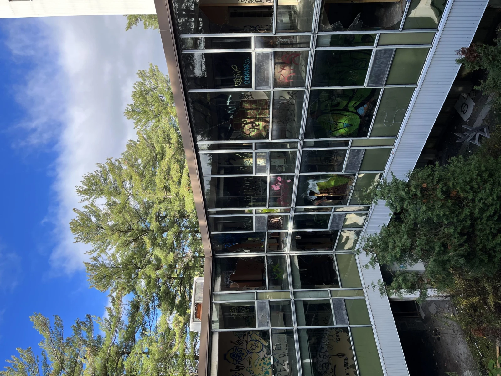 Jusqu’à maintenant, la voie est libre. On descend donc un chemin qui contourne le bâtiment et on se réfugie à l’abri des regards derrière un immeuble aux fenêtres éclatées. Mon guide du jour m’explique que le lieu abritait autrefois une communauté religieuse chrétienne jusqu’à ce que le pavillon ferme ses portes en 2015. Aujourd’hui, c’est un endroit bien connu de la communauté d’urbex et des petits vandales du coin.