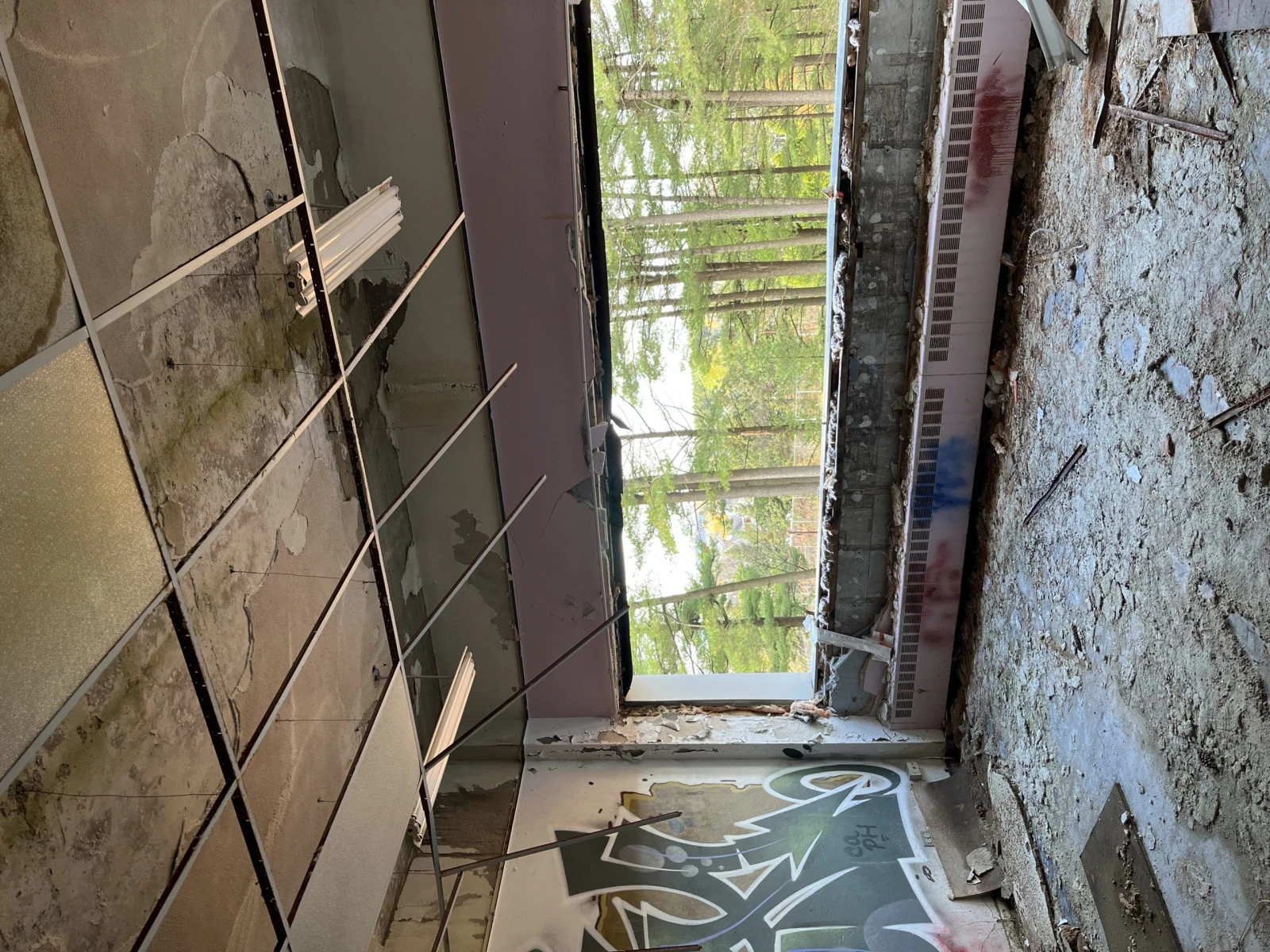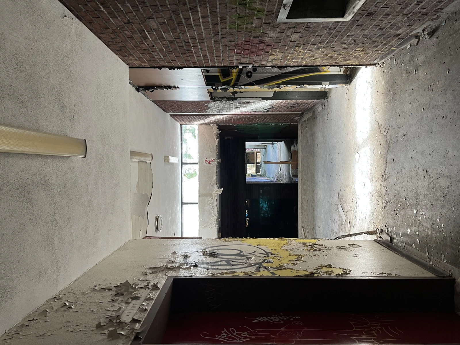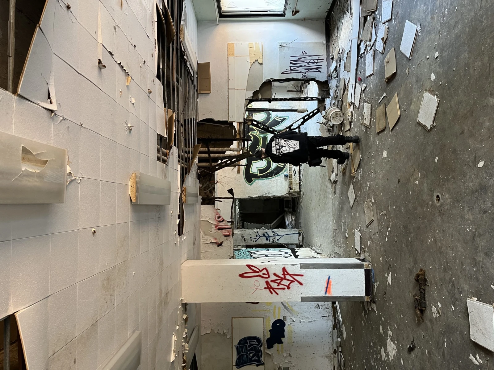 Le spectacle a l’intérieur ferait rougir d’envie les responsables des décors de shows post-apocalyptiques. Au deuxième étage, de longs couloirs garnis de graffitis, tags et autres fresques surplombent une cour intérieure verdoyante et remplie de morceaux de vitre fracassée. Les plafonds et les murs en décomposition laissent voir leurs entrailles en poutres et gyproc moisi tandis que des débris et des déchets jonchent le sol.
