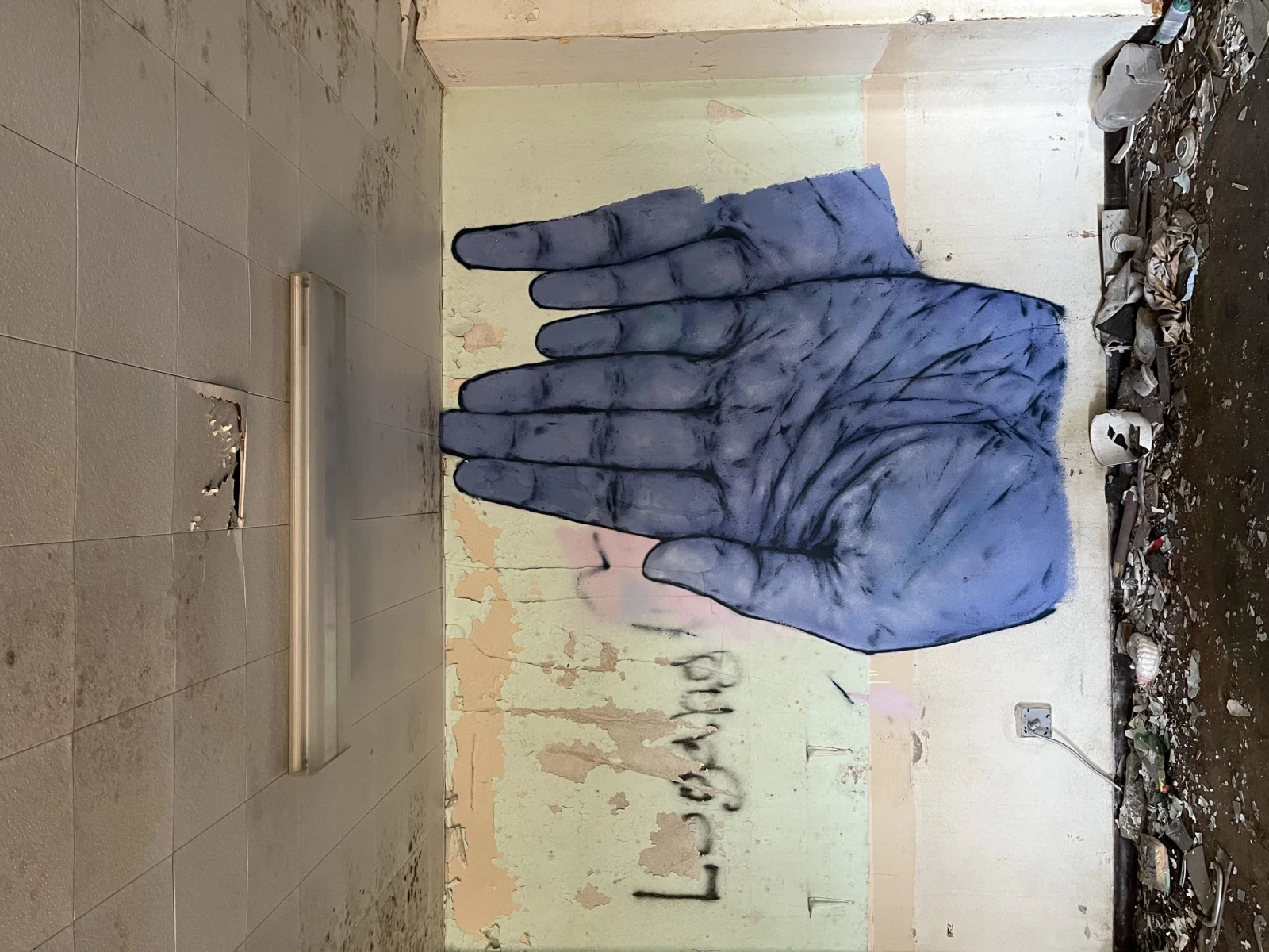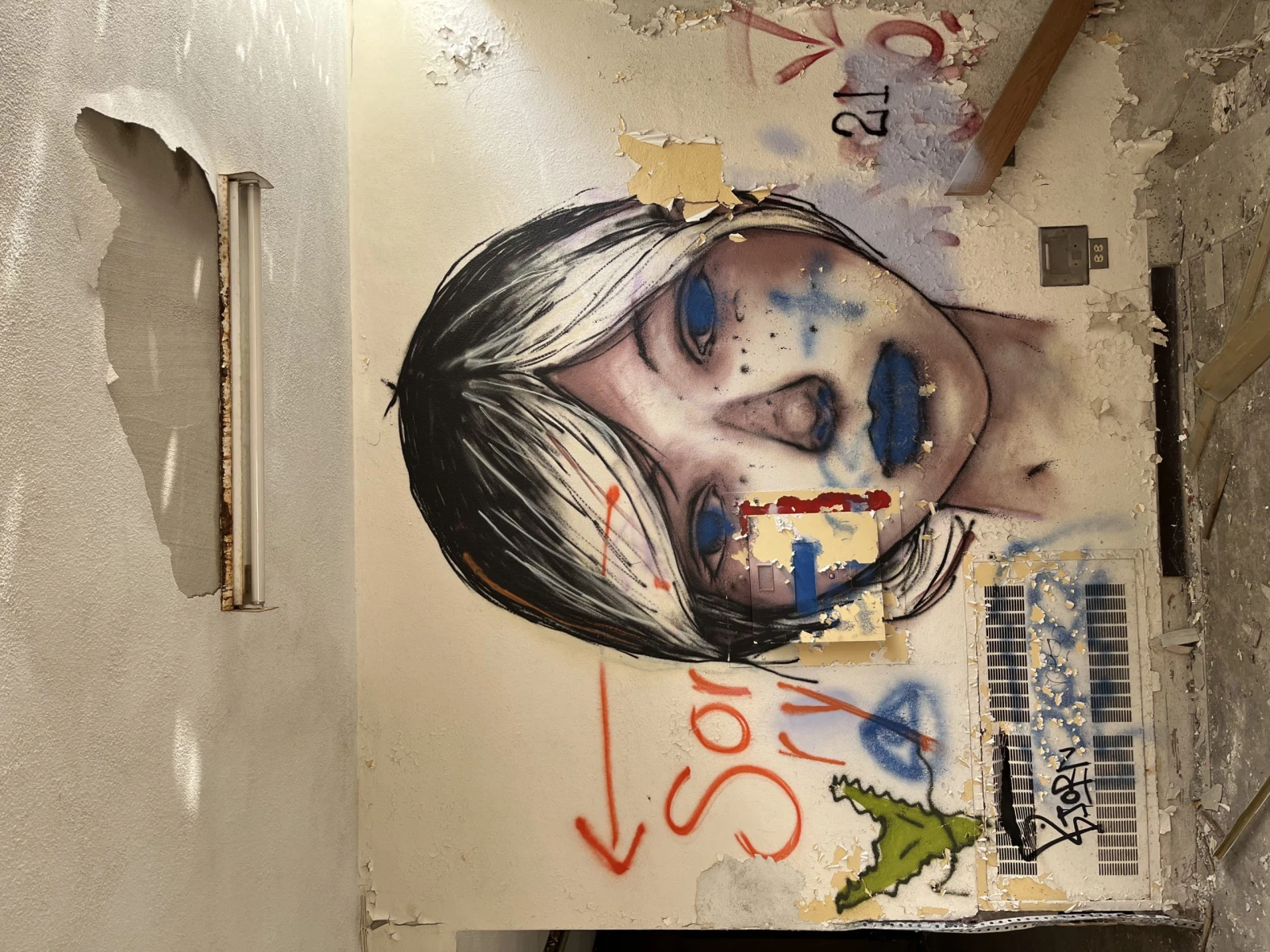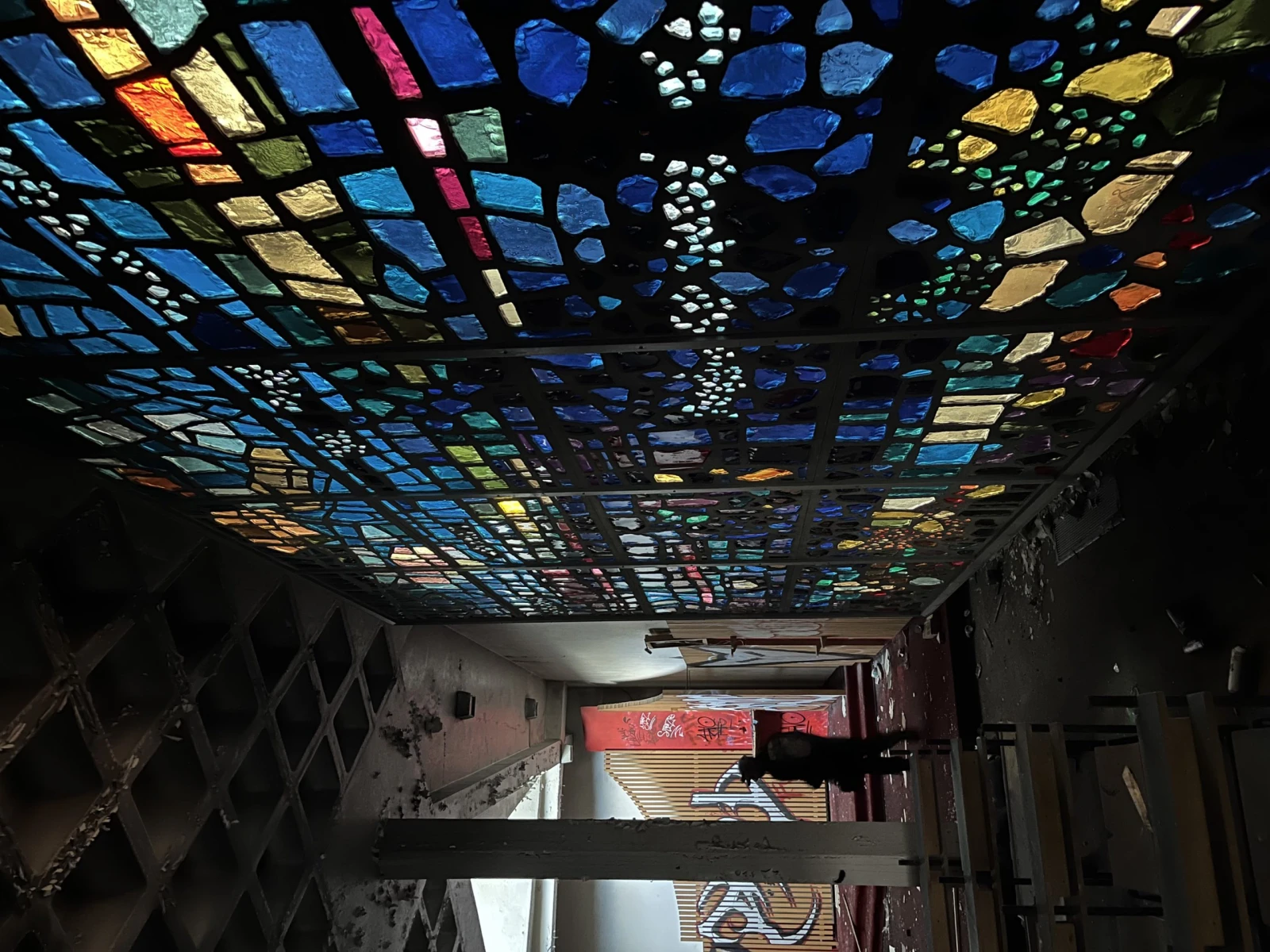 Le spectacle a l’intérieur ferait rougir d’envie les responsables des décors de shows post-apocalyptiques. Au deuxième étage, de longs couloirs garnis de graffitis, tags et autres fresques surplombent une cour intérieure verdoyante et remplie de morceaux de vitre fracassée. Les plafonds et les murs en décomposition laissent voir leurs entrailles en poutres et gyproc moisi tandis que des débris et des déchets jonchent le sol.