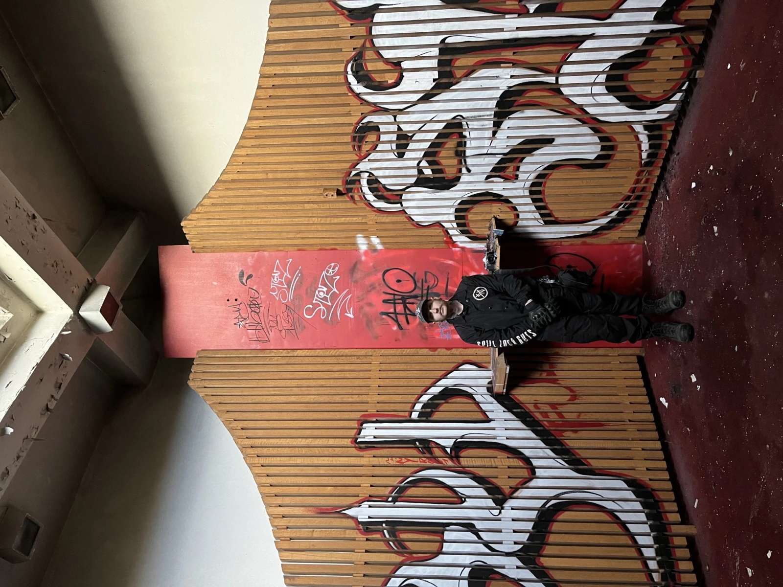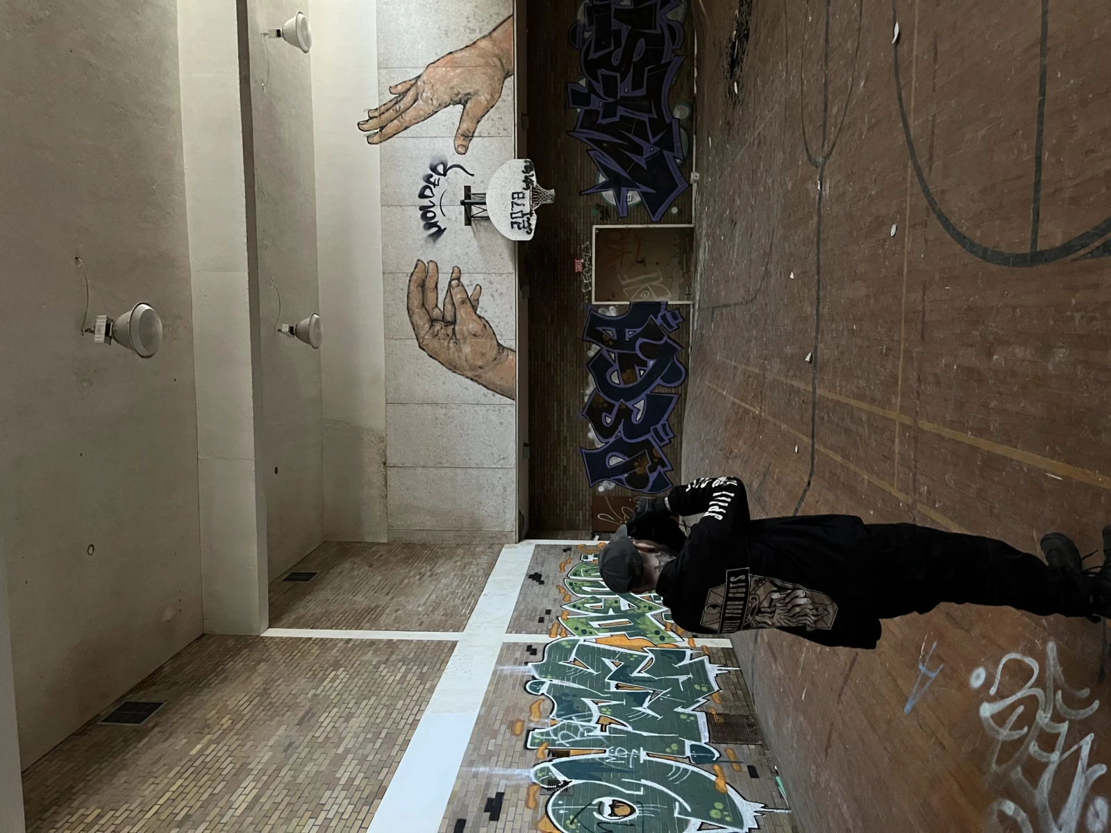 On poursuit la visite vers l’ancien gymnase, où le plancher en bois est gondolé sur les côtés, lui conférant une forme de vague. « Faut faire attention quand on marche sur du bois parce que ça peut céder plus facilement », m’indique l’urbexeur.