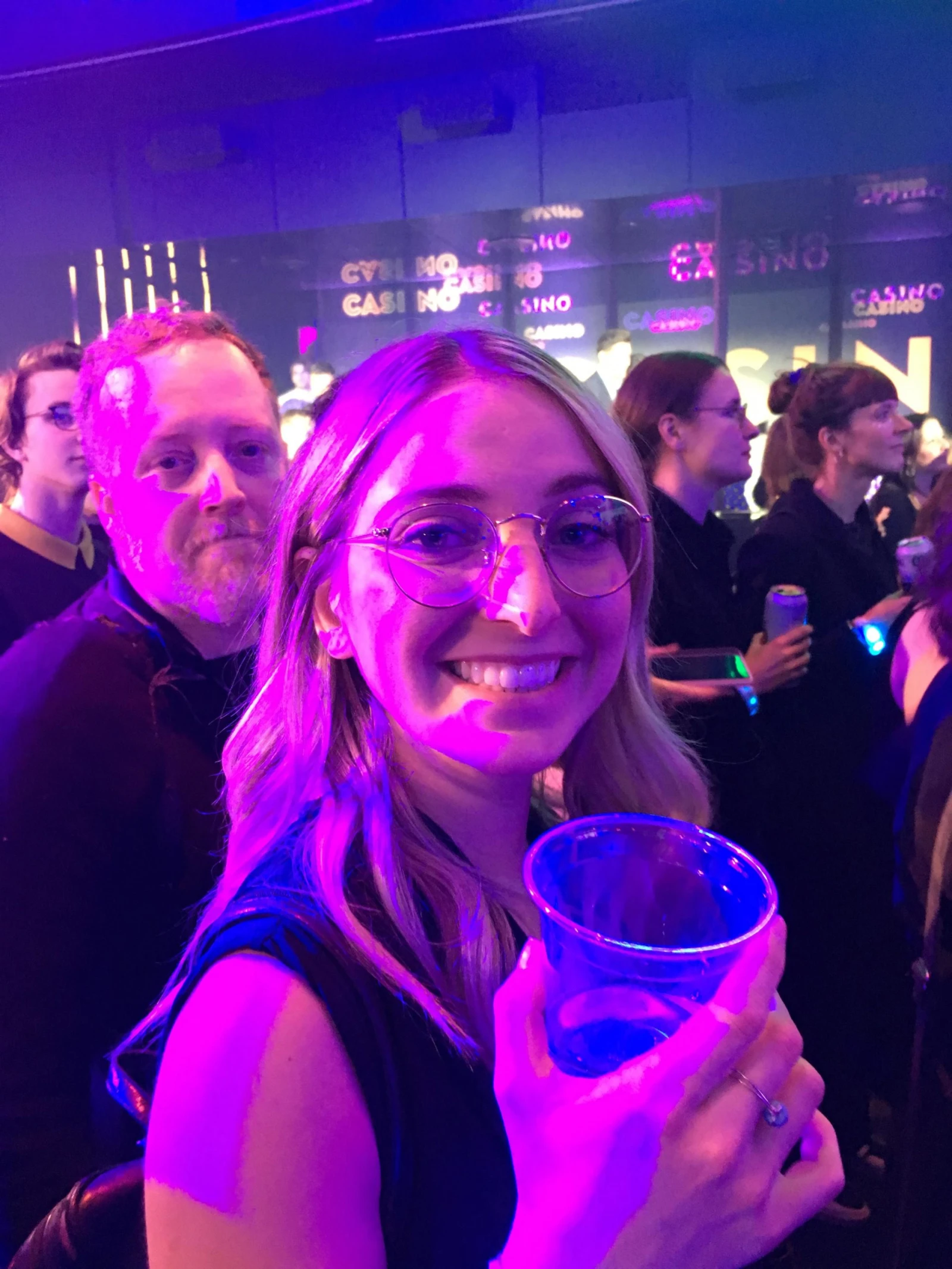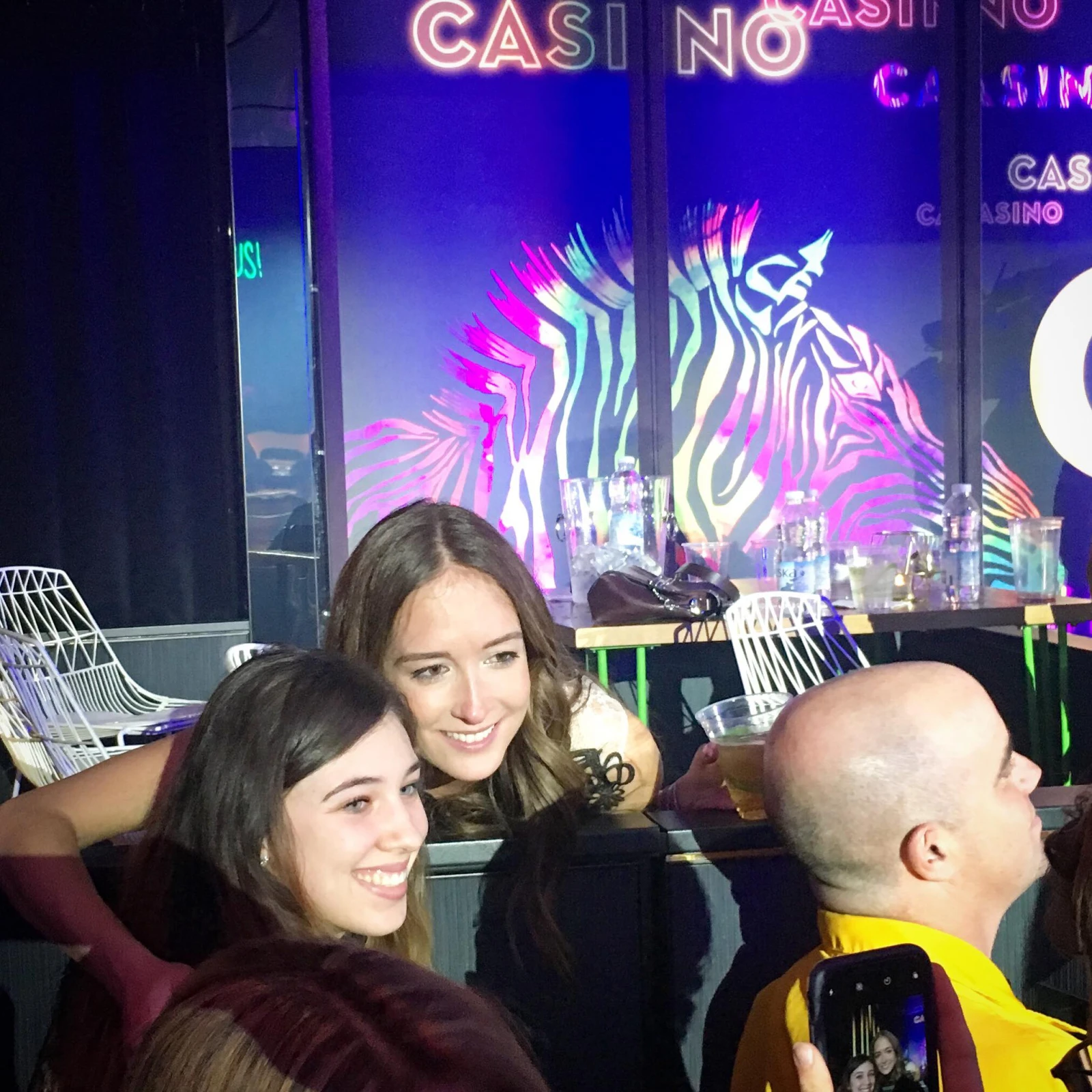 Au bout d’un dédale de machines à sous, on débouche au cabaret du casino, où auront lieu les festivités. À l’entrée, deux jeunes filles juchées sur des escarpins vertigineux nous installent au poignet un bracelet lumineux «pour l’ambiance» et nous offrent des cartons avec les minois parfaits de nos couples chouchous. Je choisis Math et Trudy, les futurs gagnants selon Jasmine.