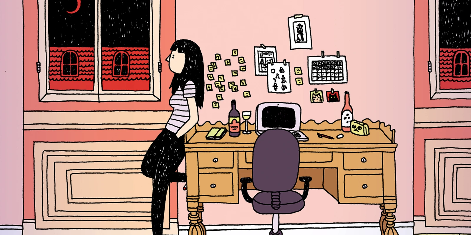 Iris aime voyager pour la job. Ça lui permet de rencontrer du nouveau monde, de voir des affaires cool et de manger plein de bonnes choses, alors c’est toujours avec empressement et enthousiasme qu’elle saute sur l’occasion de changer de décor. Elle trimballe donc ses lourdes valises remplies de sirop d’érable et de son attirail. Elle crash chez l’une et chez l’autre au gré de ses itinéraires, se faisant une multitude d’ami.es sur son passage. Elle vit à fond sa passion — la BD, duh ! — et s’y adonne avec une discipline martiale, car là réside le but ultime de son expatriation: trimer dur sur ses projets en se nourrissant de cette énergie créatrice.