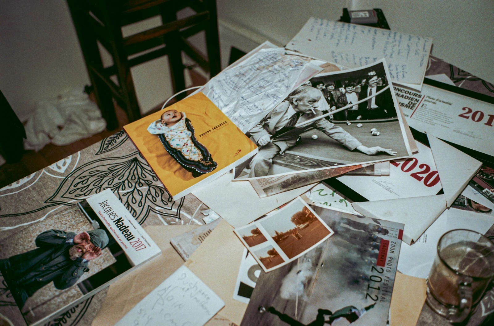 Il dépose mon café sur une table bancale, recouverte de paperasses : des numéros de téléphone griffonnés dans l’urgence, des livres, des honneurs encore dans leur emballage, des tirages, parmi lesquels celui de sa plus célèbre photo sur laquelle on peut voir René Lévesque, clope au bec, jouant au pool avec des ouvriers.