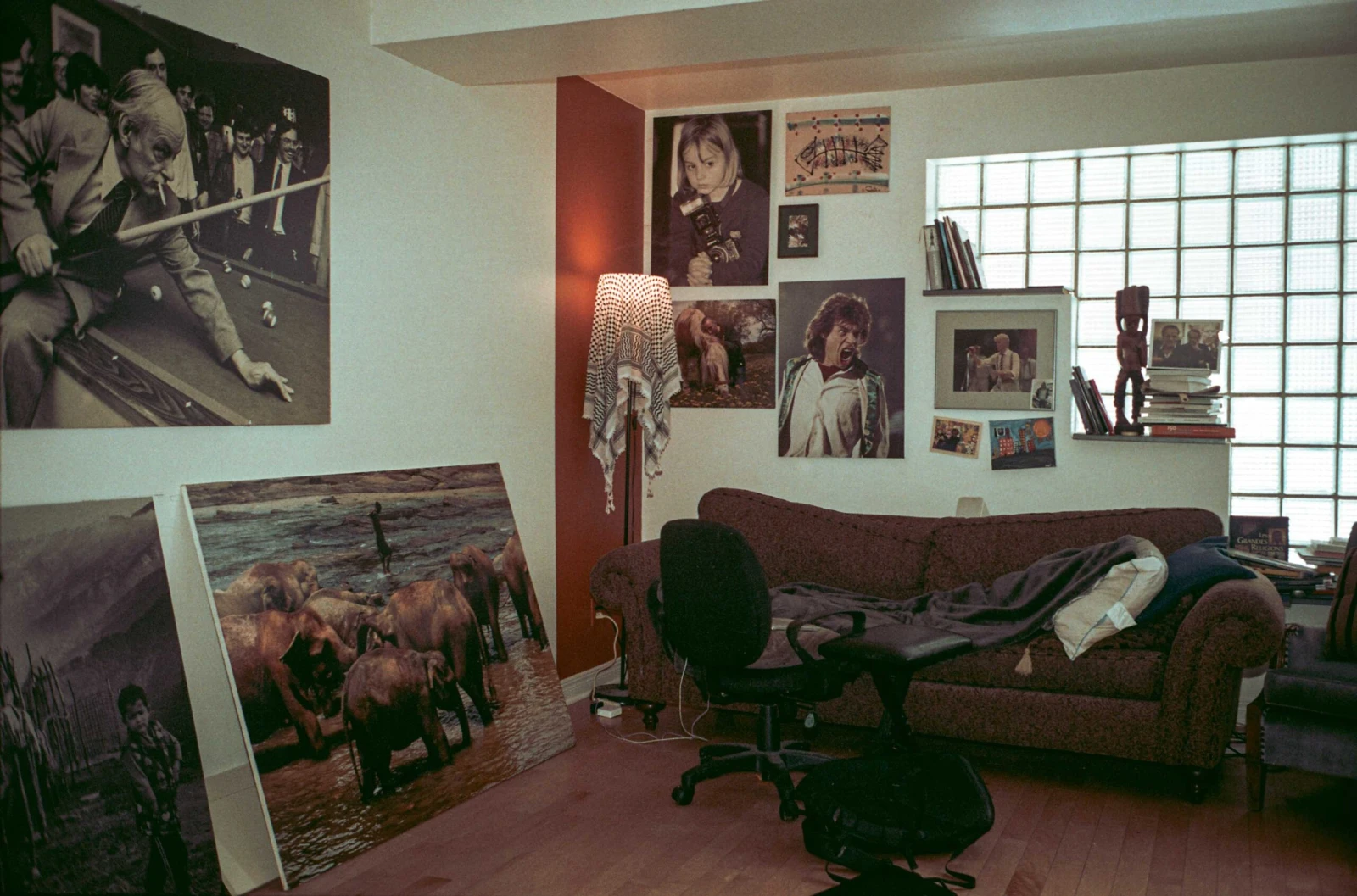 Un chou-fleur repose sur le bord de sa fenêtre qui semble être isolée avec du duct tape. Un keffieh s’improvise en abat-jour, et de grands formats recouvrent ses murs : évidemment, Lévesque au billard, mais aussi Mick Jagger, David Bowie, une bergère palestinienne. Quelques photos de l’amour de sa vie, sa fille Virginie, avec qui il est toujours très proche.