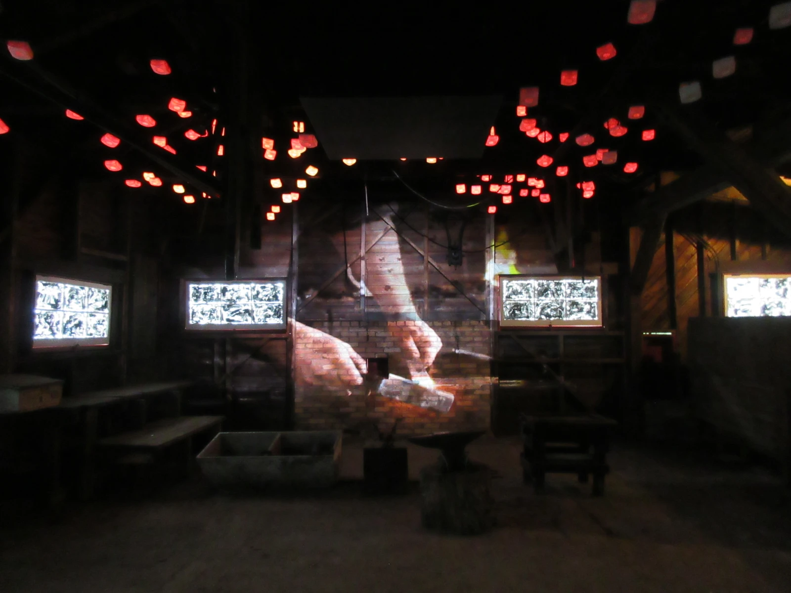 À 14 h, je fais le circuit patrimonial. La garde-parc est full impressionnée que je connaisse déjà plein de choses sur les bâtiments du poste de drave (je ne lui ai pas dit que j’ai déjà fouiné partout pendant ma randonnée ben-trop-tôt-le-matin). Elle m’ouvre ensuite la porte de la forge, où on a reconstitué l’ambiance d’antan avec des projections interactives complètement dingos.
