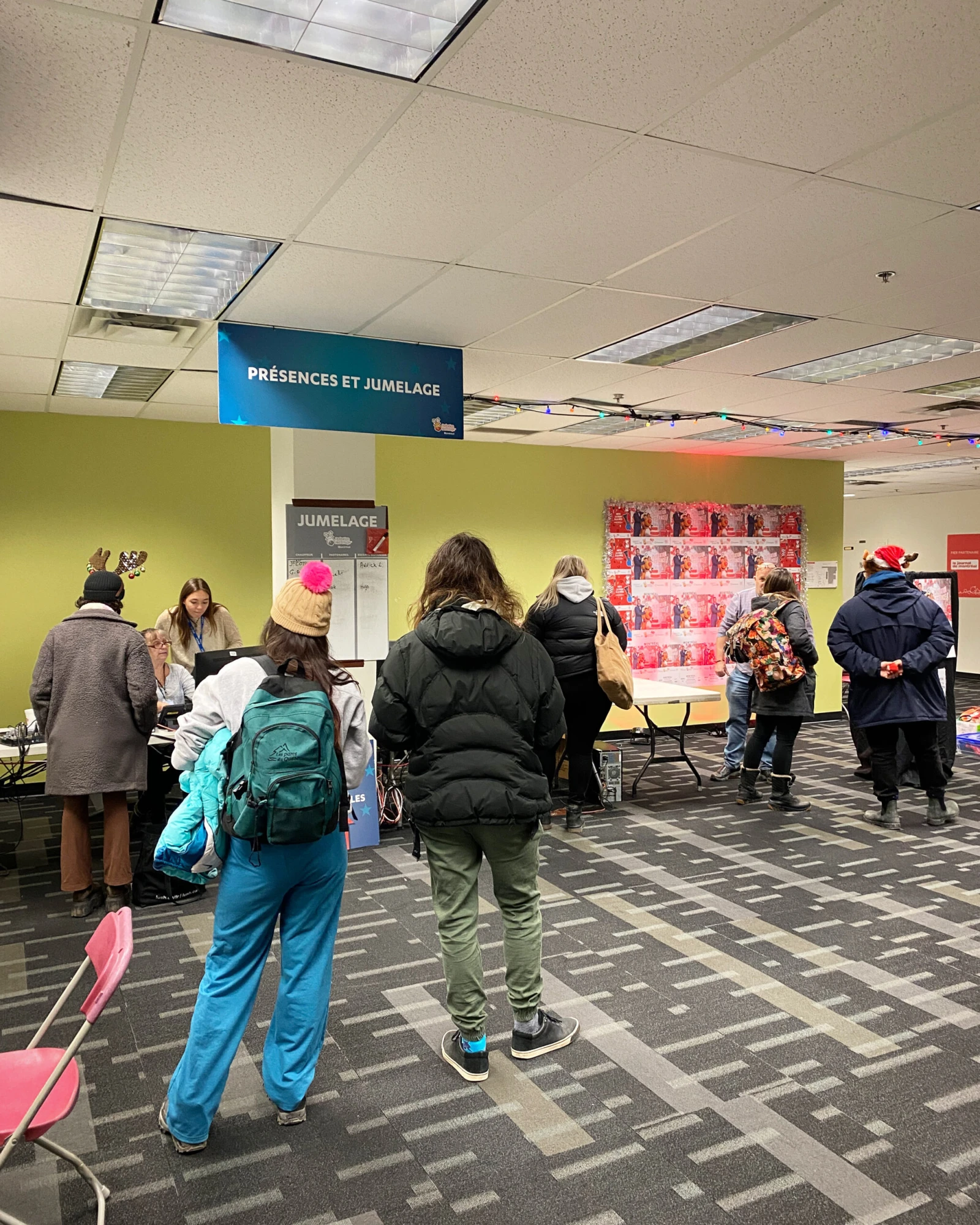 Dans la grande salle, il y a un sapin, des personnages gonflables à l’effigie du Grinch, du café, de la nourriture et même un photobooth pour permettre aux bénévoles d’immortaliser leur élan de générosité.
