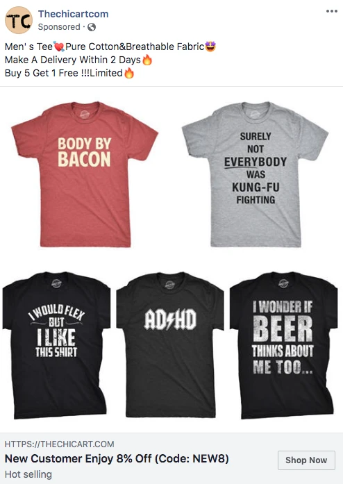 C’est drôle, parce que la dernière chose que j’ai achetée par le biais d’une pub Facebook, c’est un t-shirt. Facebook s’en rappelait clairement. La plateforme se rappelait aussi que j’étais fan de basketball (probablement parce qu’il me restait plusieurs pages liées à la NBA). C’est comme si Facebook se rappelait qu’elle me connaissait, mais qu’elle ne savait pas exactement qui j’étais et où elle m’avait rencontré.