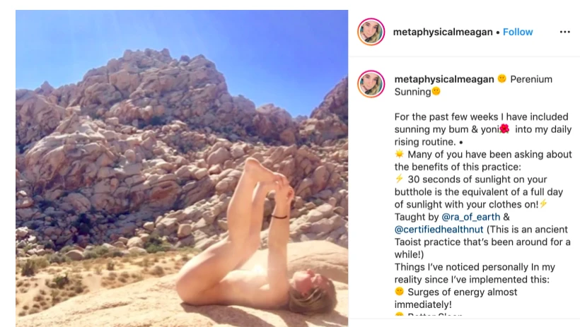 Sous la photo, la légende disait qu’elle avait commencé à exposer ses founes et sa noune au soleil, suivant ainsi une supposée très vieille tradition taoiste, «l’ensoleillement périnéen». Toujours selon Meagan, elle aurait observé les bénéfices suivants après son exposition au soleil: des vagues d’énergie, un meilleur sommeil, une meilleure connexion avec son énergie sexuelle, une augmentation de sa créativité et la liste continuait ainsi. En gros, Meagan affirme que 30 secondes d’ensoleillement du périnée équivaut à une journée entière passée au soleil.