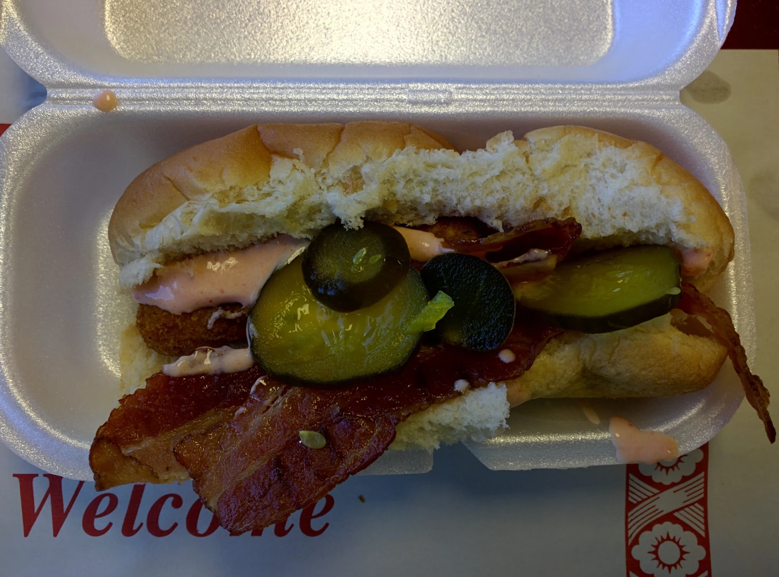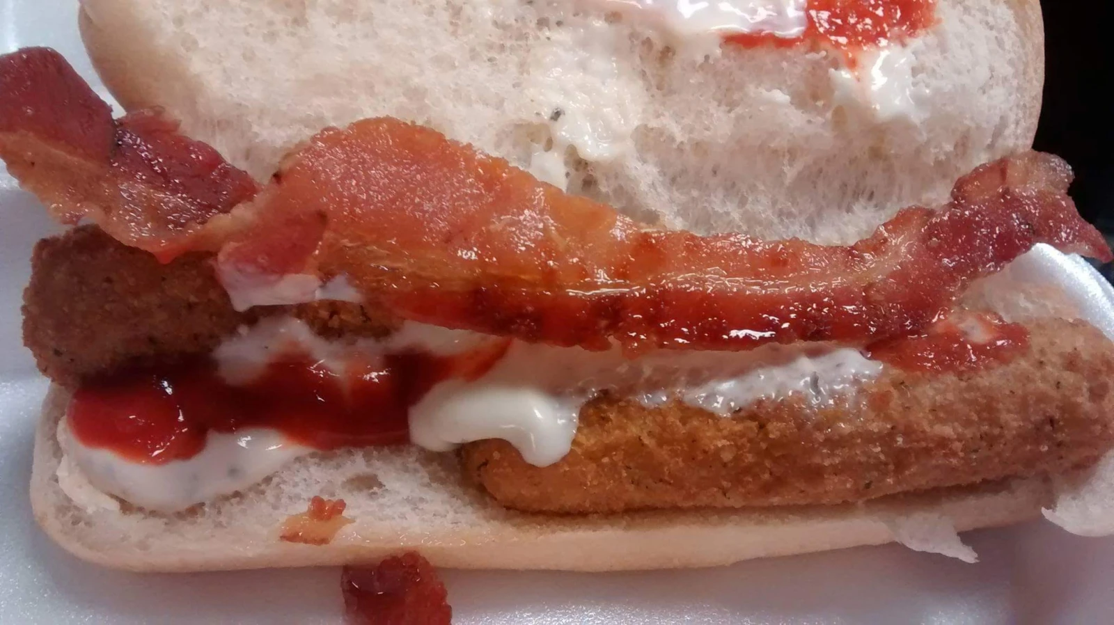 Des bâtonnets de fromage pané, dans un pain à hot dog stimé, avec une tranche de bacon, de la sauce ranch et des piments forts marinés.