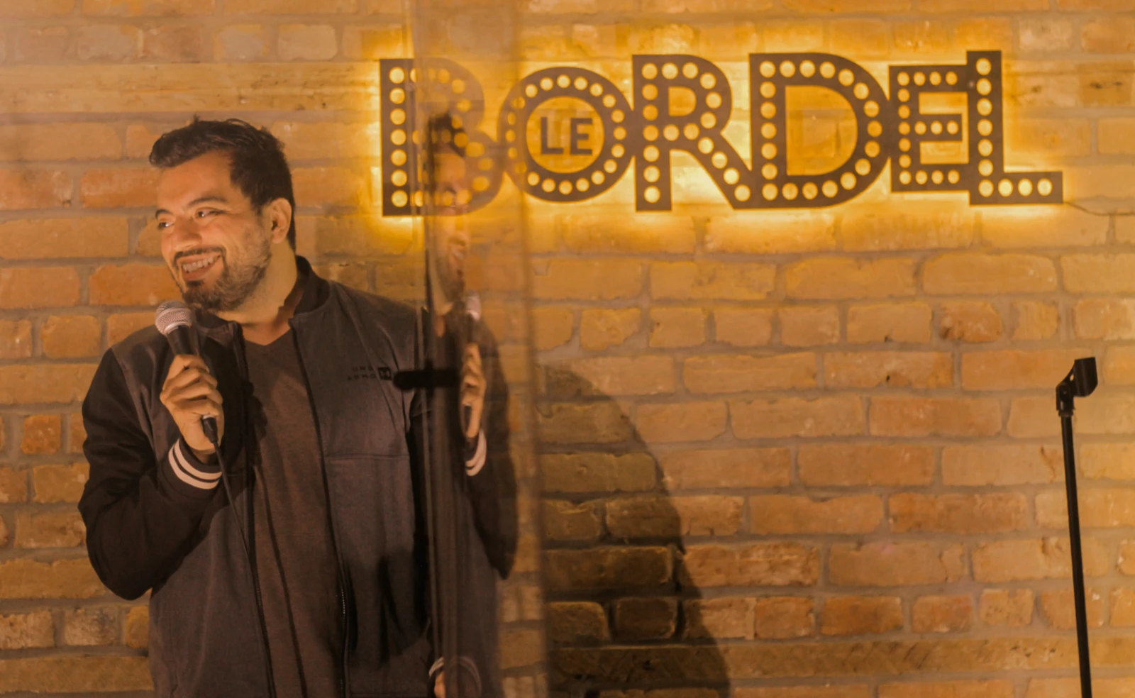 Dans ma jeune carrière d’humoriste, j’ai fait des shows dans des soupers-spectacles, dans une buanderie, dans un sous-sol avec une fille qui se tatoue au bâton devant moi et dans des parcs pour ne nommer que ces endroits saugrenus. Après toutes ces expériences, je suis bien placé pour vous dire que la meilleure place pour faire rire les gens à Montréal, c’est le Bordel Comédie Club!
