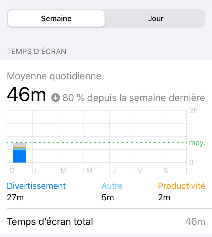 Réduire drastiquement mon temps d’écran (de 80% selon mon cell) m’a toutefois aidé à garder le focus sur ma job (mes articles étaient moins complets cependant, loin des recherches Google pour mettre plus de chair après l’os), à me coucher plus tôt (et mieux dormir) et à être moins amorphe même.