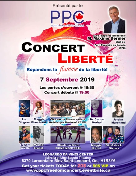 «Concert Liberté, Répandons la flamme de la liberté», claironne l’affiche promouvant l’événement organisé par le PPC, incluant une photo du chef en mortaise. Une dizaine d’artistes sont présents, sans oublier une vingtaine de candidats de la grande région de Montréal.