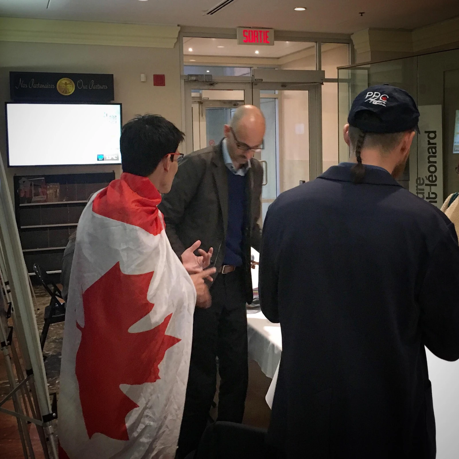 Entre les prestations, des gens défilent sur la scène pour livrer des discours. La plupart des présentations se font en anglais, mais sont simultanément traduites en français par une jeune femme et vice-versa.