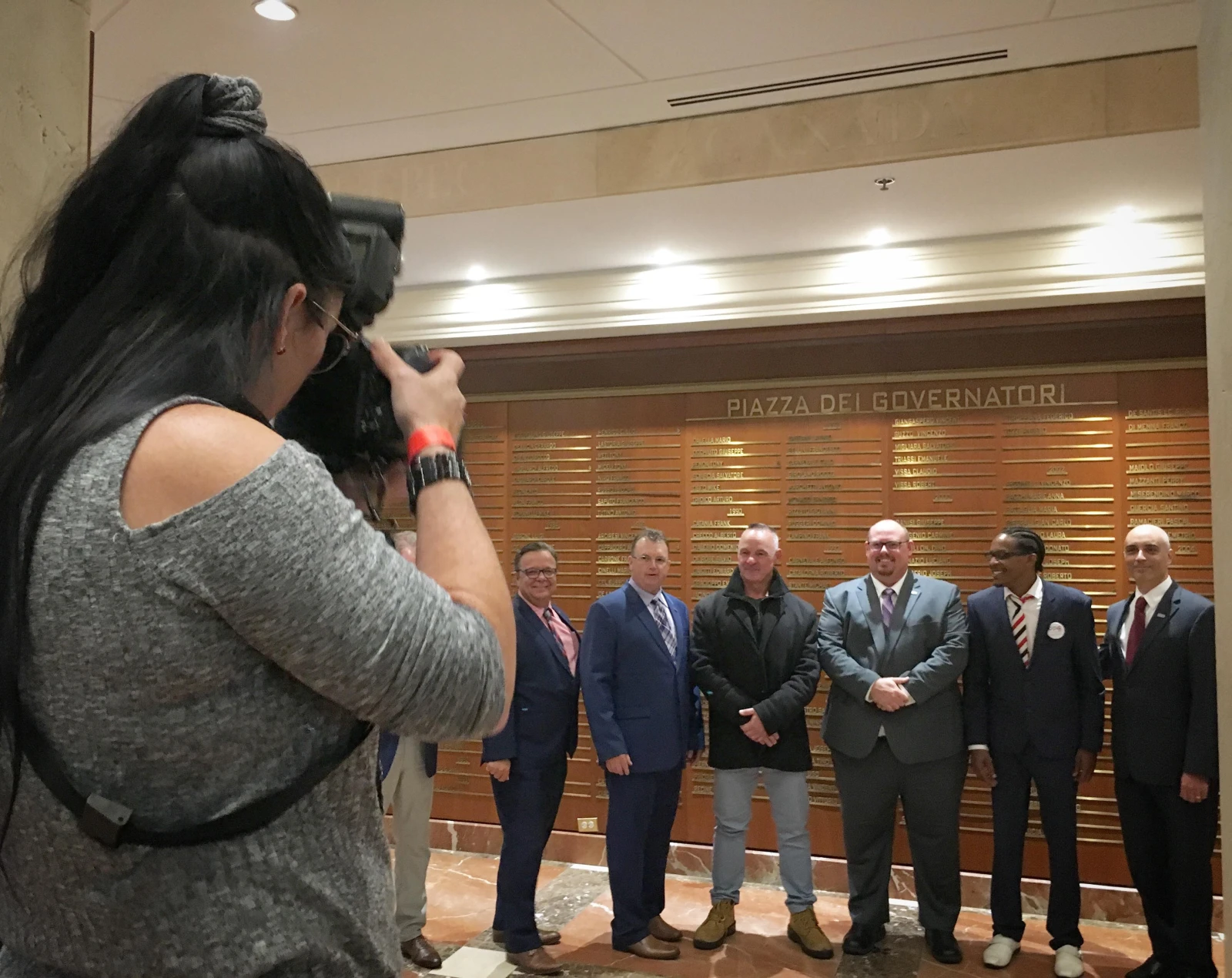 Derrière lui, plusieurs candidats prennent la pose devant une photographe officielle juchée sur une chaise.