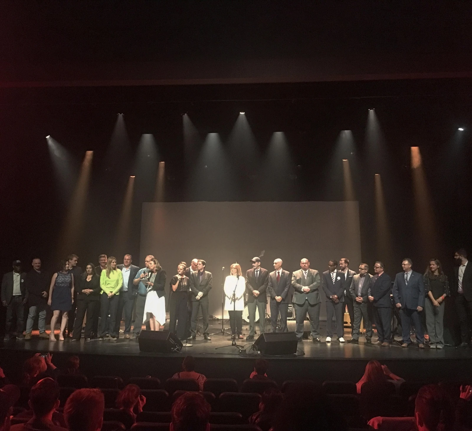 Environ 150 personnes prennent place dans la salle de spectacle. La frimousse des candidats défile sur un écran géant derrière la scène. Une demi-douzaine de personnes sont assises dans la section VIP sur le côté.