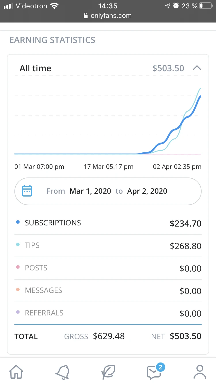 Ensuite, les abonnés peuvent laisser du pourboire sur les publications s’ils apprécient le contenu. C’est aussi possible de clavarder en privé. À partir de là, la balle est dans ton camp et tu fais pas mal ce que tu veux. Tu veux mettre des photos de tes pieds? Go for it. Tu veux mettre des photos de toi en lingerie? Go for it. Tu veux mettre des vidéos de toi nue qui chante du Wilfred LeBouthiller? Go for it.