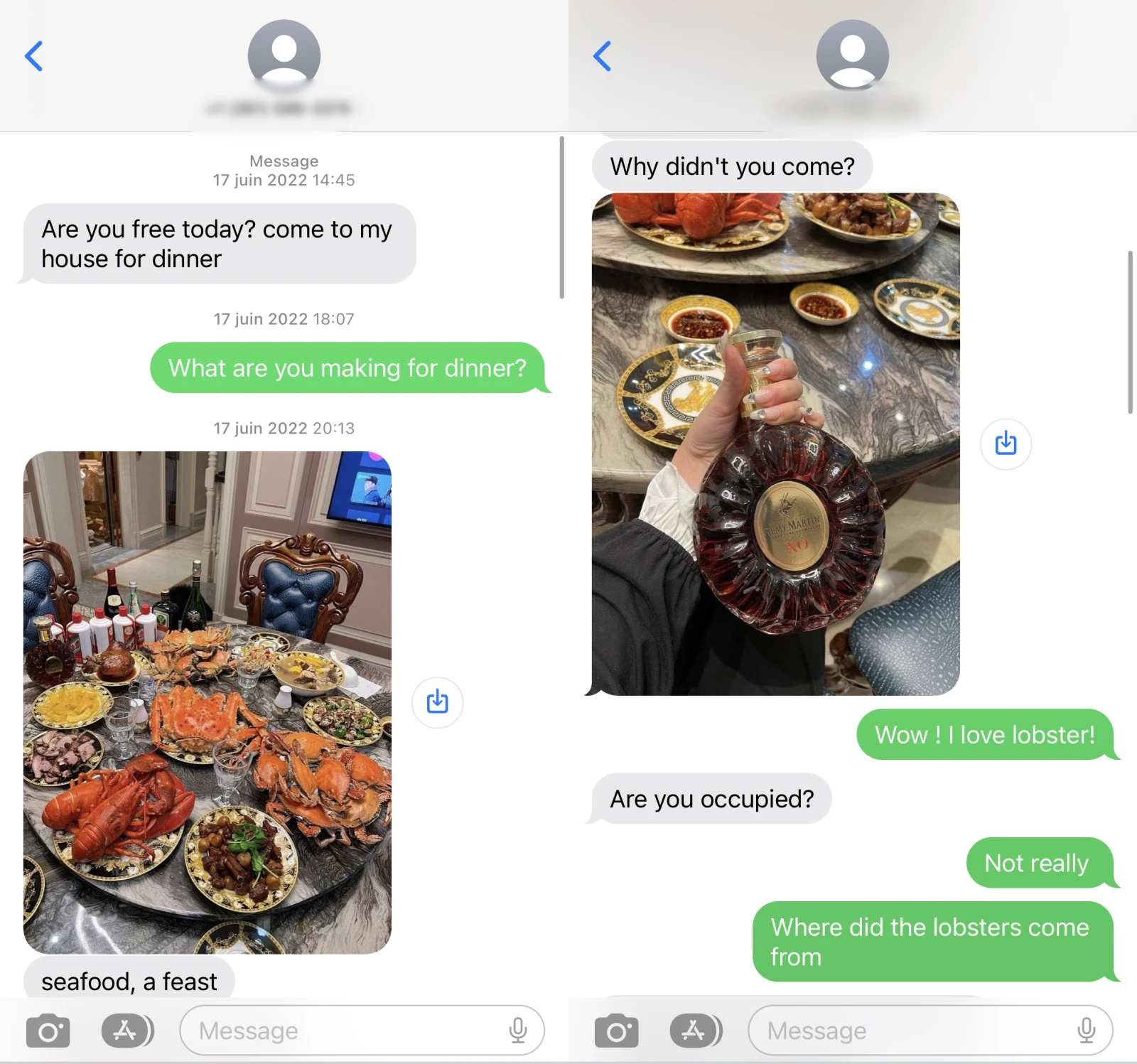 Quand je demande de quoi sera composé le souper, je reçois la photo du festin de produits de la mer que ma présumée interlocutrice s’apprête à manger. « J’ai acheté un crabe royal à 1 500 $ au marché, tantôt », m’assure-t-elle. Je remarque une bouteille de cognac qui se vend 315 $ à la SAQ. Allô l’opulence.