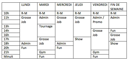 Alors que je me fais une to-do list tous les matins, je finis toujours par passer au travers, mais dans l’ordre qui me plaît. Si je sens que j’ai un trop-plein d’énergie en me levant et que c’est le meilleur moment pour aller faire un tour au gym, j’y vais. Si je me sens plutôt créatif, je me mets à écrire des jokes.