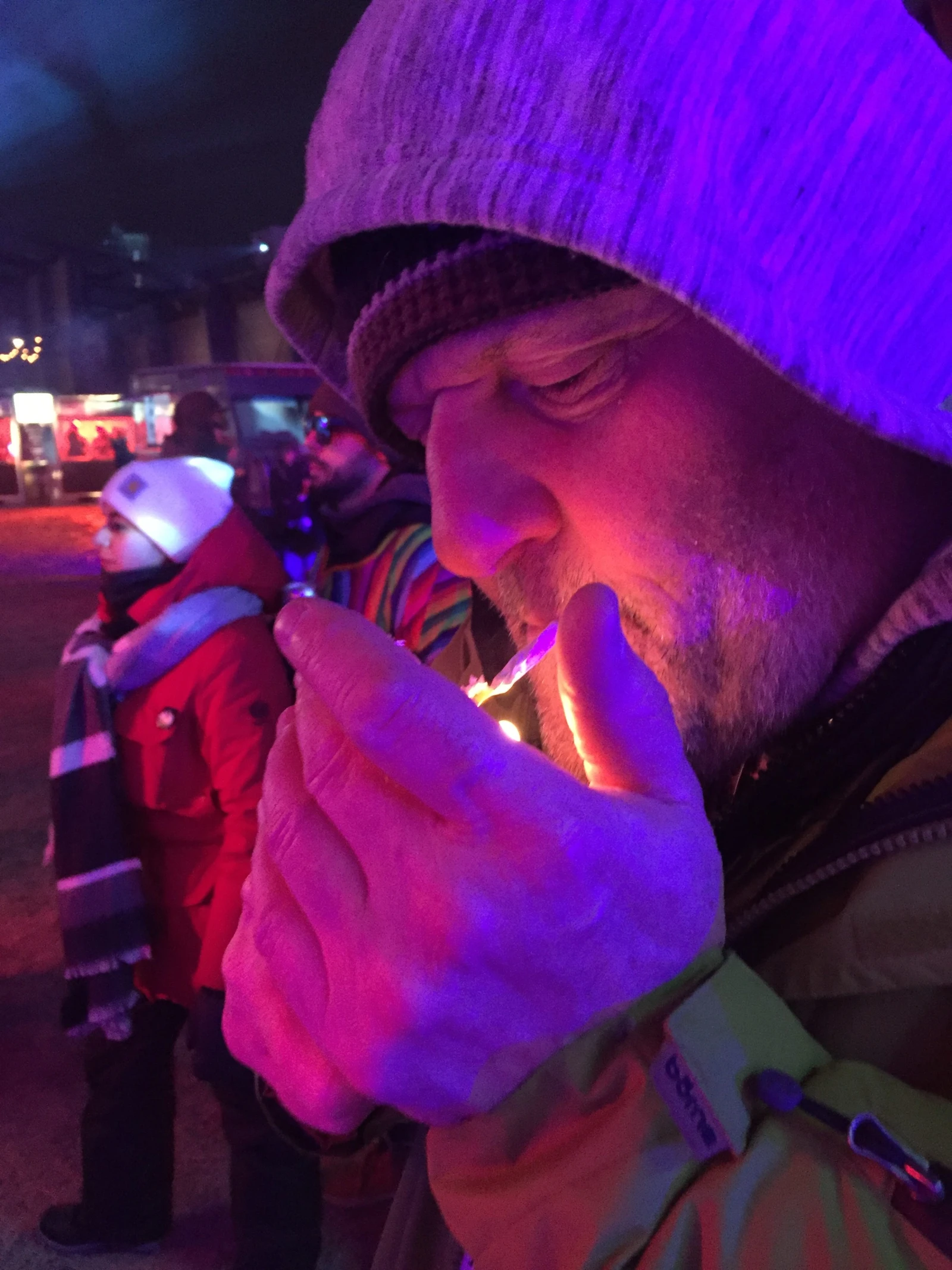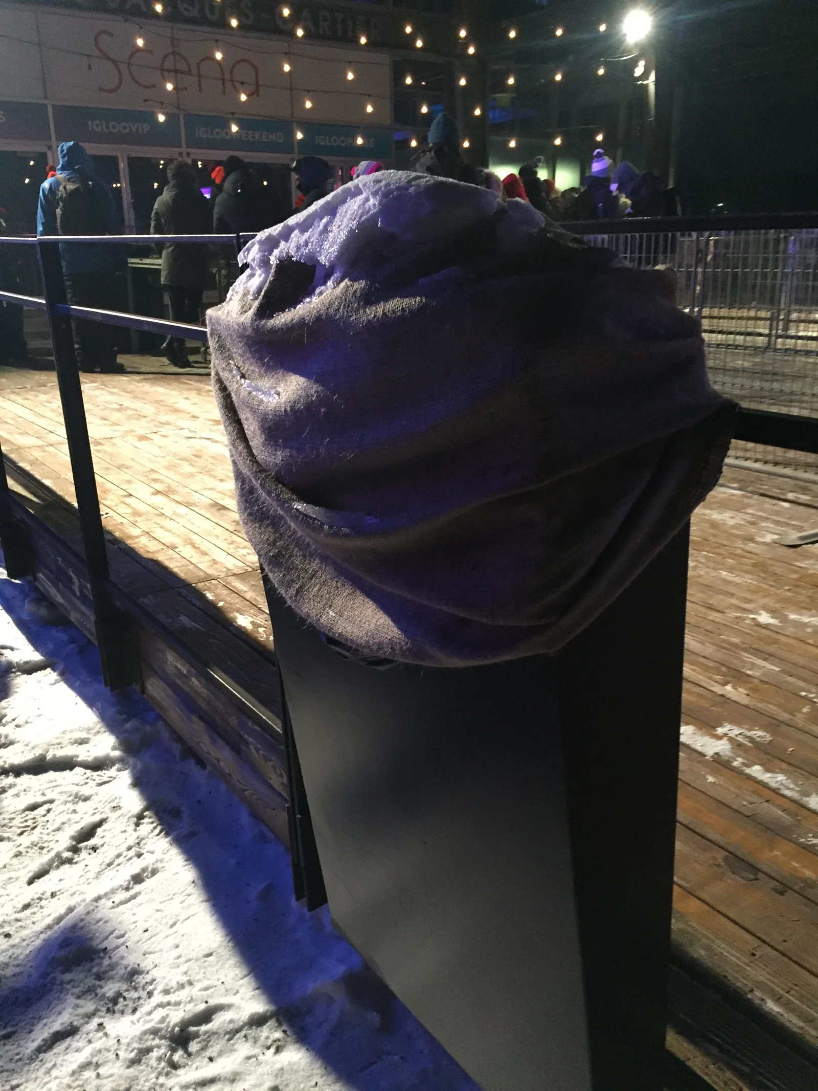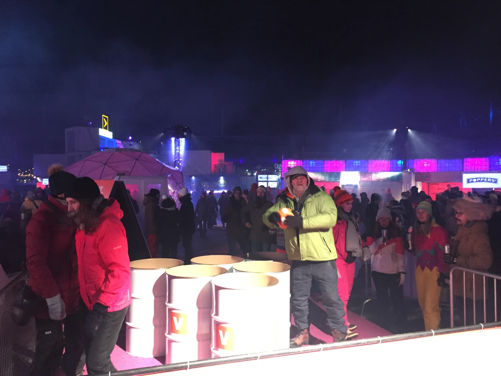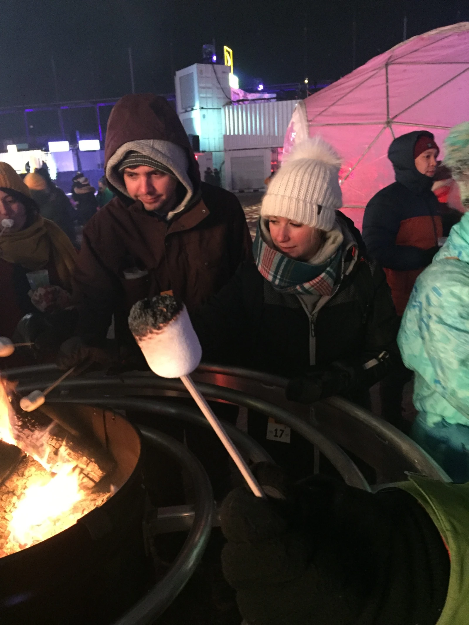 Bien gelés, nous nous réfugions aux abords du feu pour y faire cuire une guimauve gracieusement offerte par Igloofest. L’exercice est moins réussi que prévu.