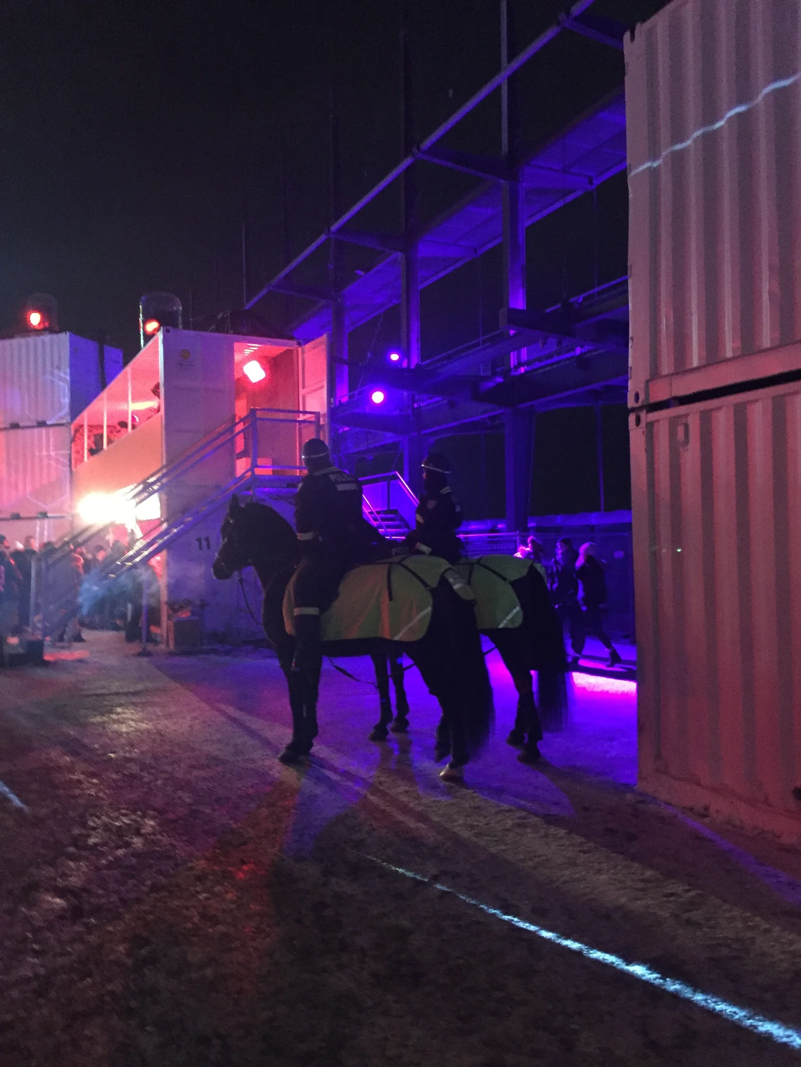 Je profite de cet enthousiasme marqué pour le faire sortir dehors, direction scène Vidéotron. En chemin, l’escouade équestre de la police lui fait de l’œil.