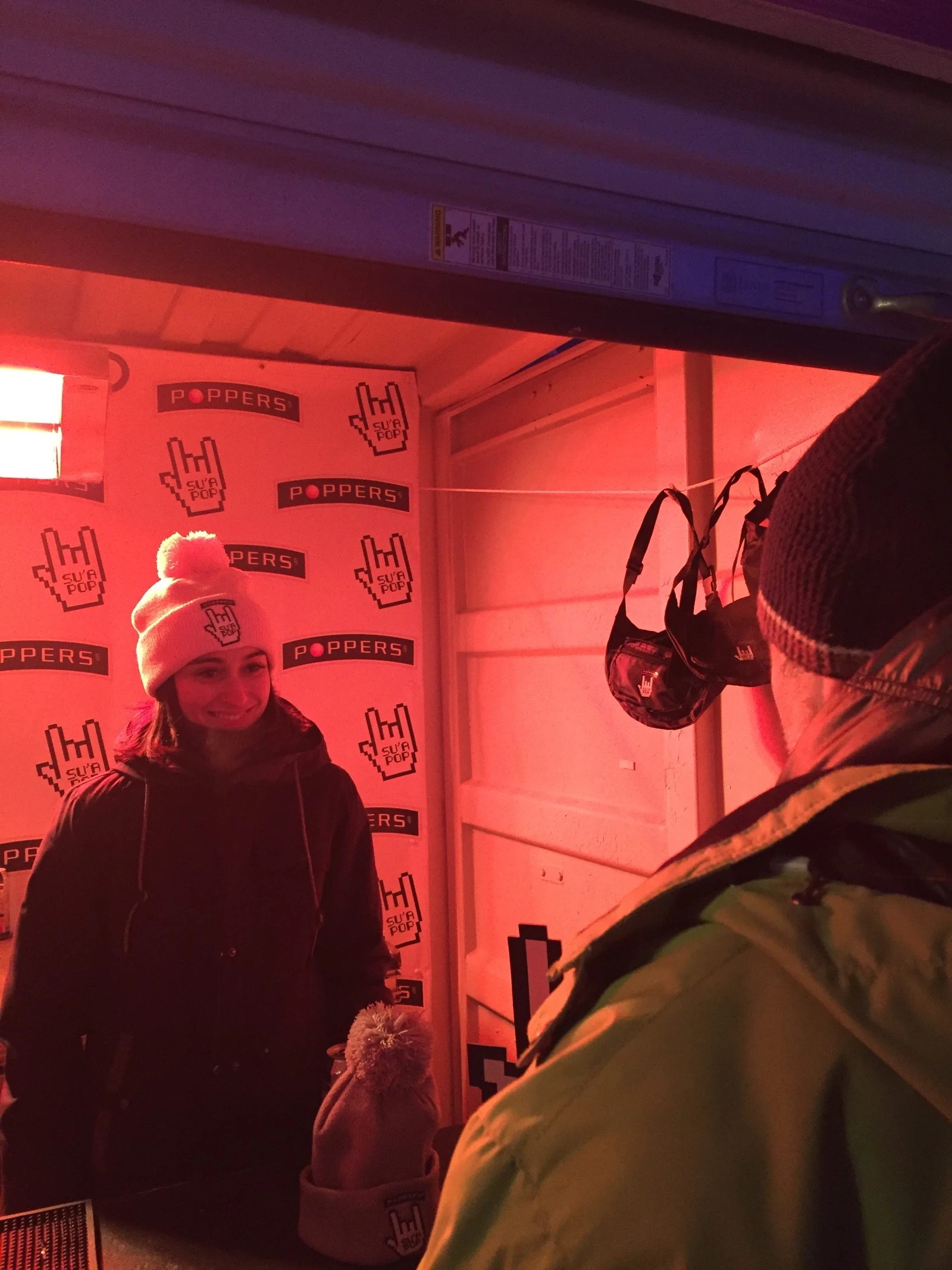 On se dirige alors vers le kiosque Poppers. Après trois petits shooters de dégustation, son choix se rabat sur l’énigmatique sorte à la framboise bleue. « C’est vraiment un goût intéressant. Ça fait changement », dit-il à la préposée.