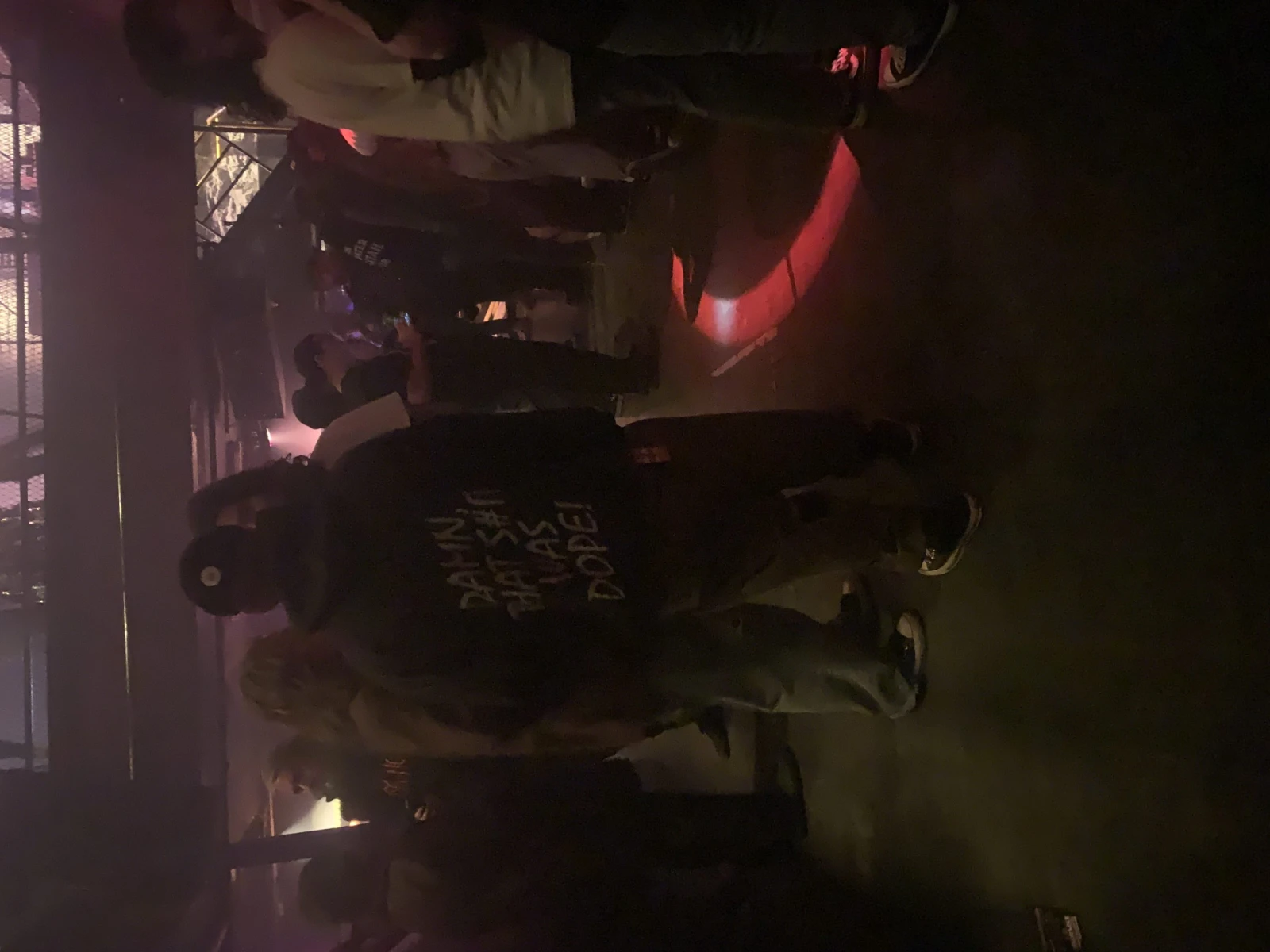 On fait tranquillement connaissance, accoudés au fond de la salle pendant que les premiers spectateurs arrivent. Des barbes grises. Des petites bédaines. Des tattoos. Des piercings. Quelques couples aussi. Des punkettes d’environ mon âge avec un style impeccable. Beaucoup de monde habillé pour la guerre avec des vêtements à sacrifier, mais beaucoup d’autres sur leur 36 aussi. Dans une palette de couleurs sombre et chaotique, on s’entend, mais sur leur 36 quand même.