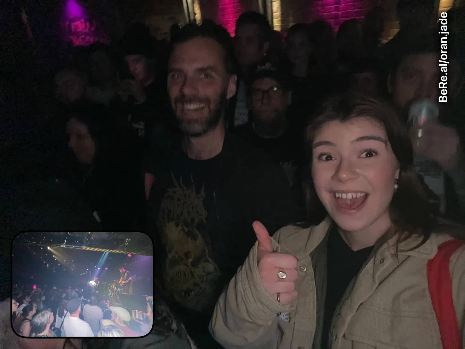Un homme corpulent derrière nous raconte à sa conjointe avec enthousiasme et plénitude à quel point ce soir, il distingue mieux la guitare de la basse que sur les enregistrements originaux. « Il est vraiment cute », me confie Jade avant de me faire poser pour un BeReal. Non, ceci n’est pas une blague sur la génération Z. On a vraiment pris un BeReal ensemble. J’ai l’air un brin terrifié.