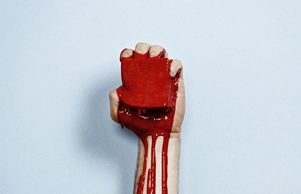 Le bras gauche levé, brandissant un carré rouge sanglant, une main de fer, un petit biceps au cas où la société en aurait besoin… Le bras gauche pointe vers l’avenir… Sur fond bleu espoir.