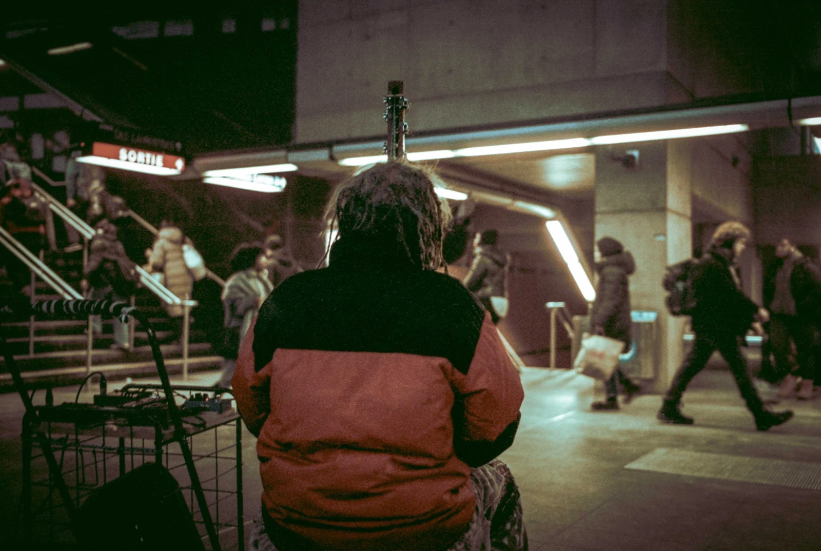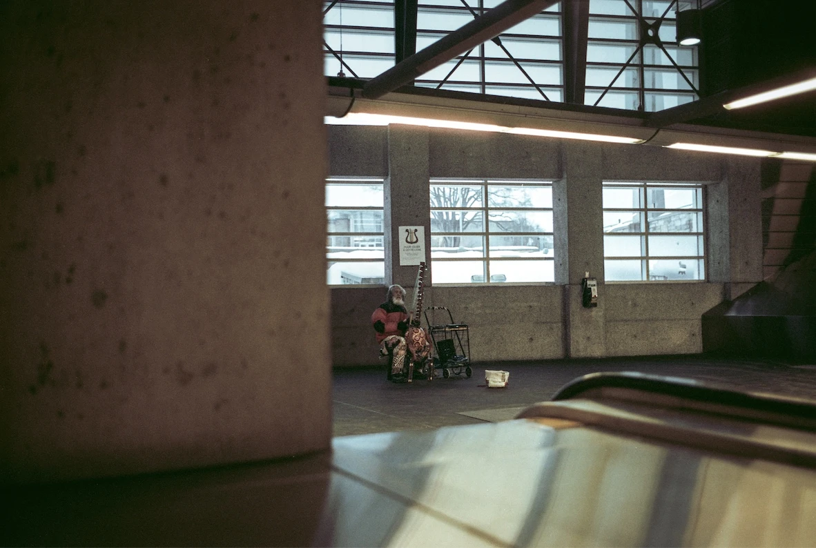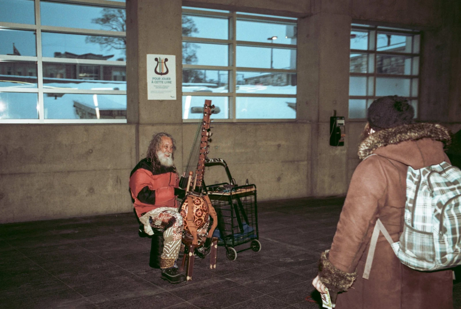 À mon instar, les usagers s’arrêtent, émerveillés pour un bref instant évanescent. Certains ferment les yeux, d’autres le questionnent sur son étrange instrument, tandis que plusieurs fouillent leurs manteaux et lui offrent quelques pièces.