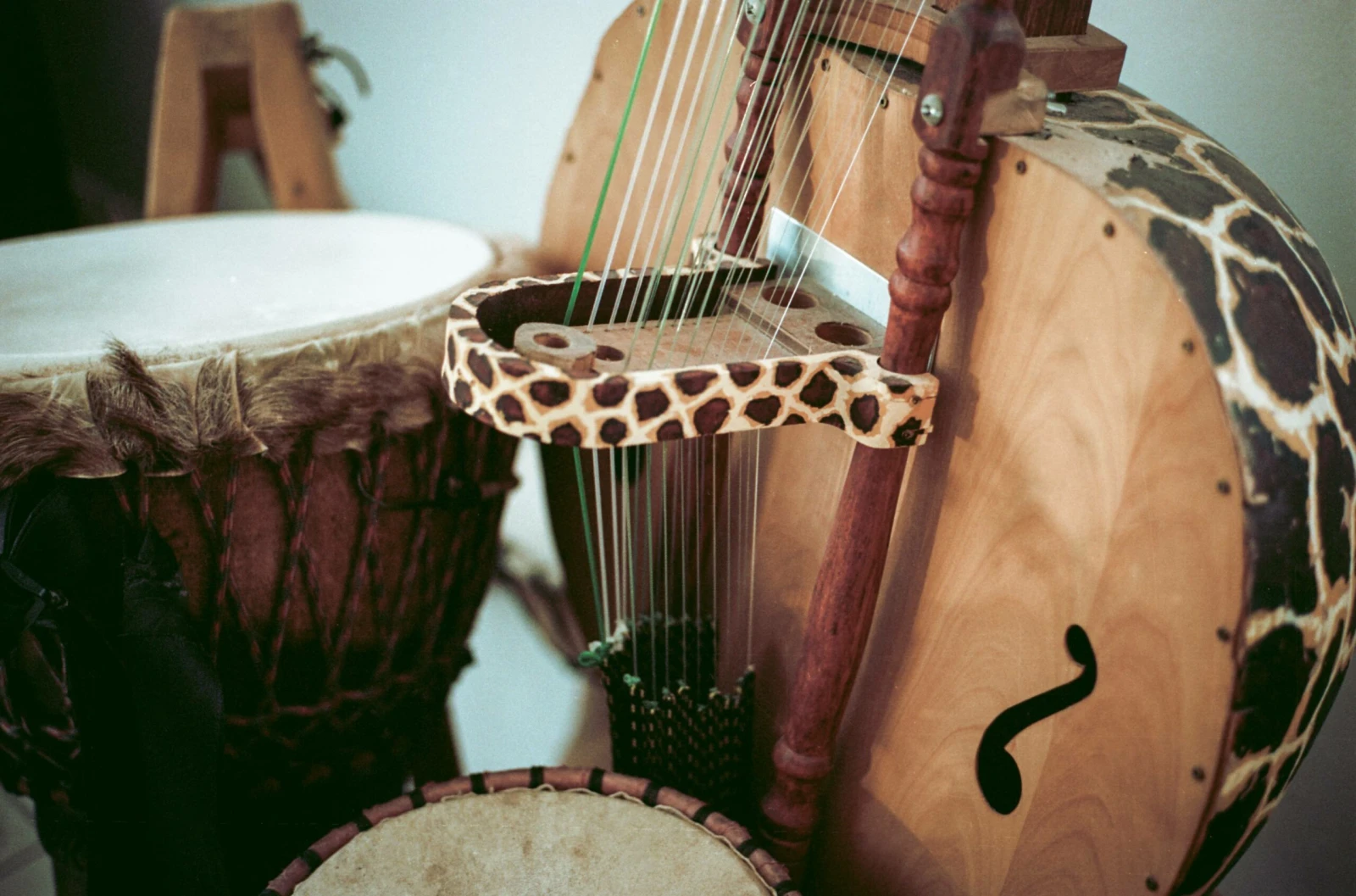 La kora est un instrument à cordes pincées étroitement lié à la tradition mandingue. Historiquement jouée par les griots de l’Afrique de l’Ouest, elle se compose d’une caisse de résonance recouverte d’une peau animale attachée à un manche en bois.