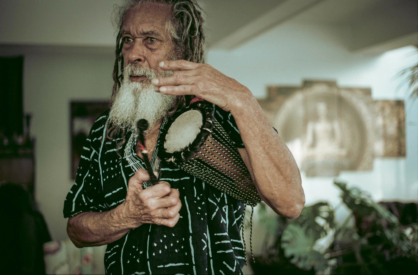 Un temps des Fêtes plus tard, me voilà installé sur une véranda lumineuse donnant sur un vaste jardin enneigé. Vêtu d’un dashiki, Jeremy est enveloppé dans un décor rassurant composé de plantes, de sculptures de Bouddha et d’instruments de musique.