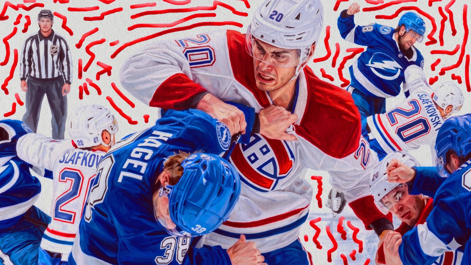 Tout ce long préambule pour dire qu’au sortir de mon hibernation de fan, je tombe en bas de mon sofa devant le festival de claques sur la gueule qui se distribuent sur la glace. Juraj Slafkovsky qui mange une volée contre Brandon Hagel, le brasse-camarade suivant chaque coup de sifflet, le colosse de Tampa Bay, Scott Sabourin, qui frappe Josh Anderson en traître.