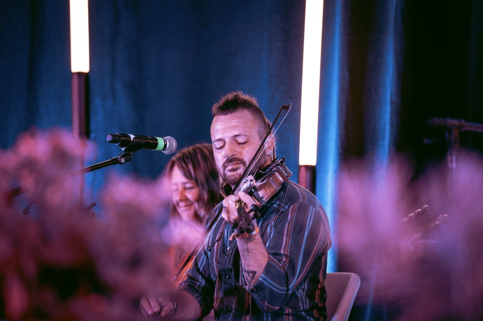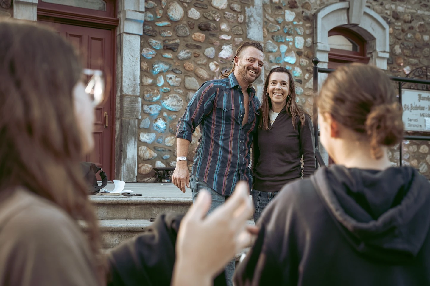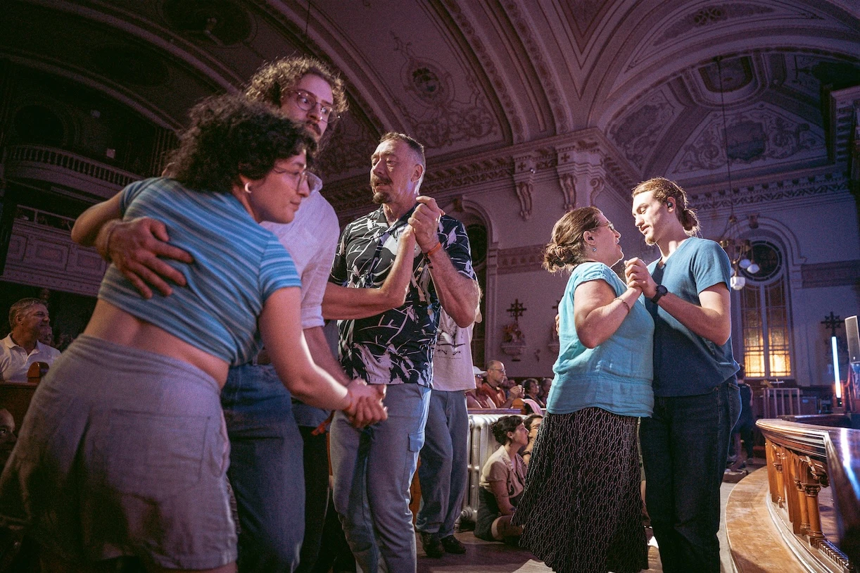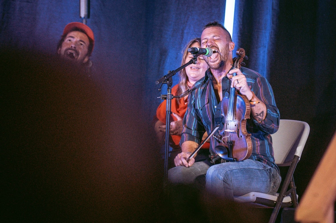 Avant que Jourdan et les Rodaîlleurs, littéralement « ceux qui voyagent », son groupe de tournée depuis 2018 — prennent la scène, une formation bien de chez nous fait monter la température. Chansons de Charlevoix à répondre, claquements de cuillères, ambiance de Soirée canadienne dans une église bondée à 40 degrés.
