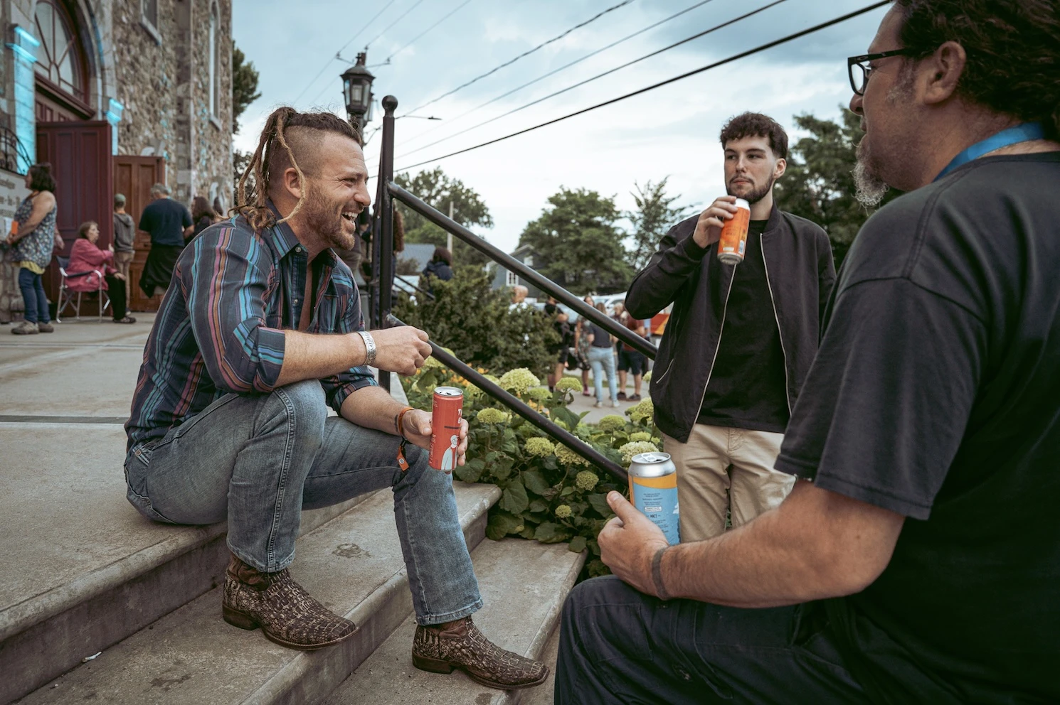 « J’peux vous interrompre une seconde?, lance un jeune homme avec les mains pleines de canettes. J’suis un fan. Tenez, j’vous ai apporté des cidres. Bienvenue au Québec! »