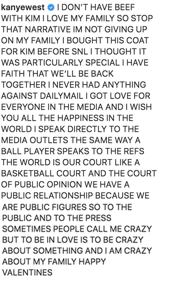 Ye s’en prend à elle sur une plateforme publique, tantôt par le biais de la confrontation directe, tantôt par la supplication. Ses outils d’intimidation sont multiples, allant de la publication de conversations privées avec Kim à l’humiliation de son nouveau partenaire sur les réseaux comme dans ses chansons en passant par l’achat d’une maison juste en face de la leur. « LES GENS ME TRAITENT DE FOU, MAIS ÊTRE EN AMOUR C’EST ÊTRE FOU », se justifie Ye dans son post de Saint-Valentin. Et cette phrase devrait sincèrement nous mettre la puce à l’oreille.