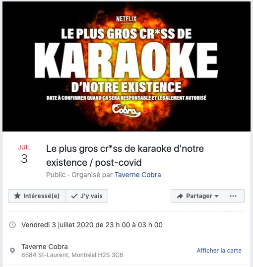 On a entre autres bien hâte d’aller à la Taverne Cobra par exemple, où une invitation FB nous convie au « plus gros cr*ss de karaoké d’nôtre existence ».