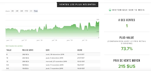 Selon StockX, le dernier modèle « Volt » atteignait un prix moyen de 215$ US, soit 74% de plus que sa valeur originale. Toutefois, il est important de noter que ce modèle n’était pas exactement identique au OG (avec un Swoosh blanc plutôt que gris). Ainsi, puisque c’est la première fois que le modèle a une réédition identique, le gain d’une revente risque d’être beaucoup plus considérable, surtout pour les grandes pointures. À titre d’exemple, le site de revente GOAT vous permet de vous procurer le modèle OG pour la modique somme de 450$ US.