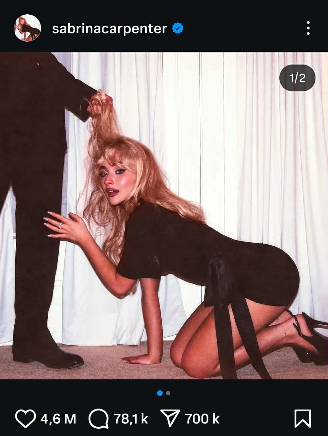 Again, je comprends ce que Carpenter dit, mais je me demande vraiment quel est le mérite artistique de sa photo? Le cliché est littéralement cliché. Il n’y a aucun message, aucune profondeur, aucune subtilité. De mon point de vue, la photo est faussement edgy puisqu’il n’y a absolument rien de subversif dans le fait de voir une jeune femme à la bouche entrouverte et aux yeux de biche, à quatre pattes devant un homme anonyme qui la domine.