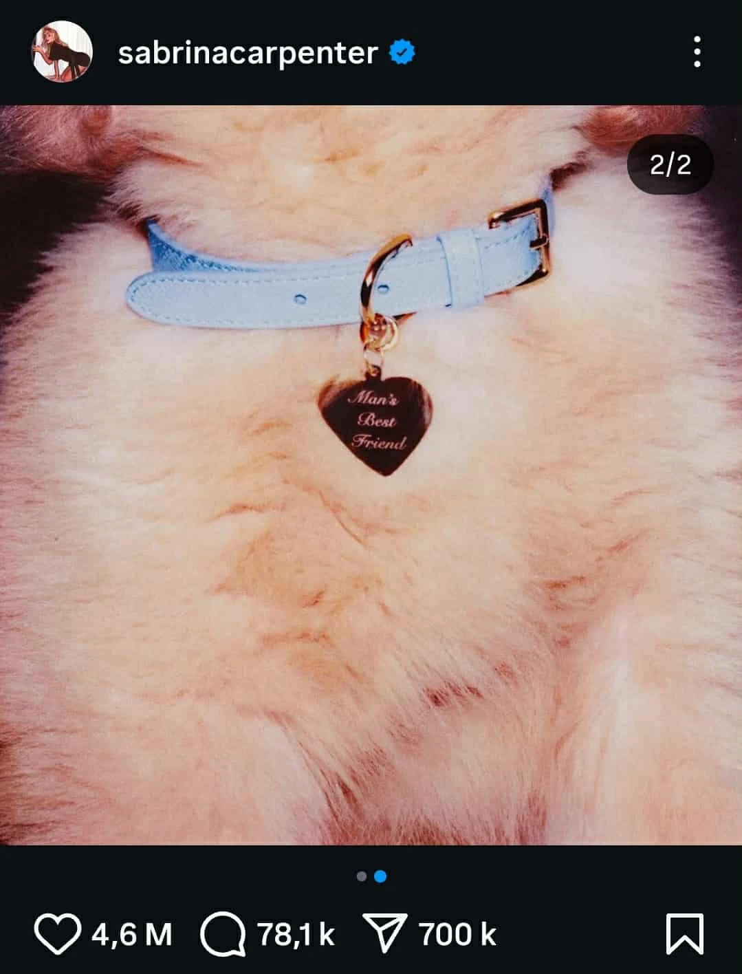Au verso de la pochette, on voit le thorax d’un chien et son cou orné d’un collier et d’une médaille sur laquelle on peut lire « Man’s Best Friend ». Le meilleur ami de l’homme. Quand on combine les deux photos, on peut aisément comprendre la métaphore audacieuse derrière : Sabrina Carpenter est une chienne.