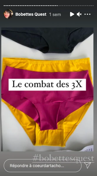 « Depuis le début de ma démarche, plusieurs compagnies m’ont approché pour que je leur donne des conseils, m’explique celle qui souhaite faire de la Bobettes Quest un projet constructif avec des répercussions concrètes. Par exemple, une compagnie montréalaise, qui fait parfois des bobettes sur mesure pour les personnes plus size, mais qui souhaite éventuellement en commercialiser, m’a approchée et m’a envoyé un prototype de bobette 3X pour que je leur donne mes commentaires. C’est positif. Je me dis que j’ai peut-être un avenir de consultante on the side, pour aider les compagnies avec le marché plus size, dans la production, mais aussi dans le marketing. »