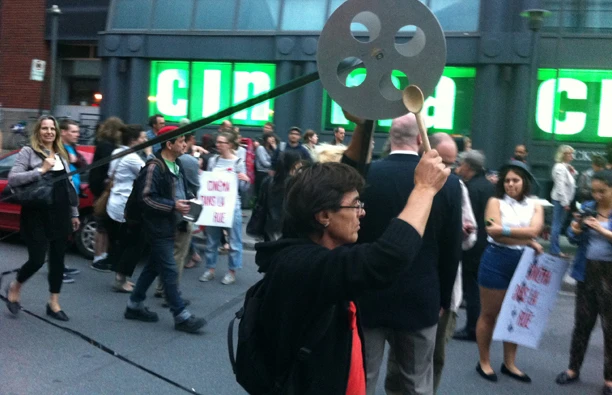 Coin Maisonneuve-St-Denis, en regardant autour de moi, je me disais bien que c’était vital d’être là, tous ensemble pour la cause, contre Harper et son charcutage en bonne et due forme du financement de la culture, contre la fermeture de la Cinérobothèque, pour sauver la salle de cinéma de l’ONF, appelée à fermer. J’en ai reconnu plusieurs qui y ont présenté leur premier film. Et nous savons combien la diffusion en salle est importante, voire sacrée pour un cinéaste car elle demeure une condition sine qua non à l’indispensable sceau «d’artiste subventionnable». Il faut protester, agir, élever la voix. Parce que, comme Paule Baillargeon l’a si bien dit lors de la conférence de presse de lundi, «nous perdons ce lieu et nous perdons un écran pour le cinéma. Celui qu’on appelle le grand.»