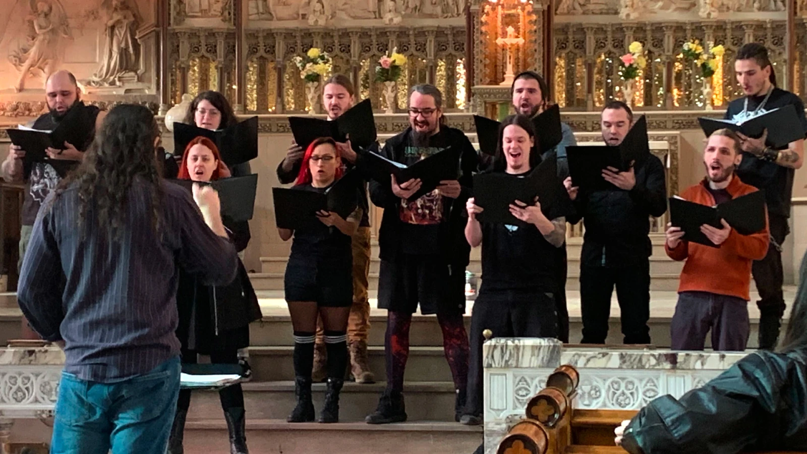 C’est la première pratique dans l’église et l’une des premières occasions où les deux chœurs sont réunis pour assembler les pièces du casse-tête. Le chef de chœur Pascal Germain-Berardi organise les métalleux en rangée sur les marches qui mènent vers l’autel, avec les membres de Temps Fort derrière.