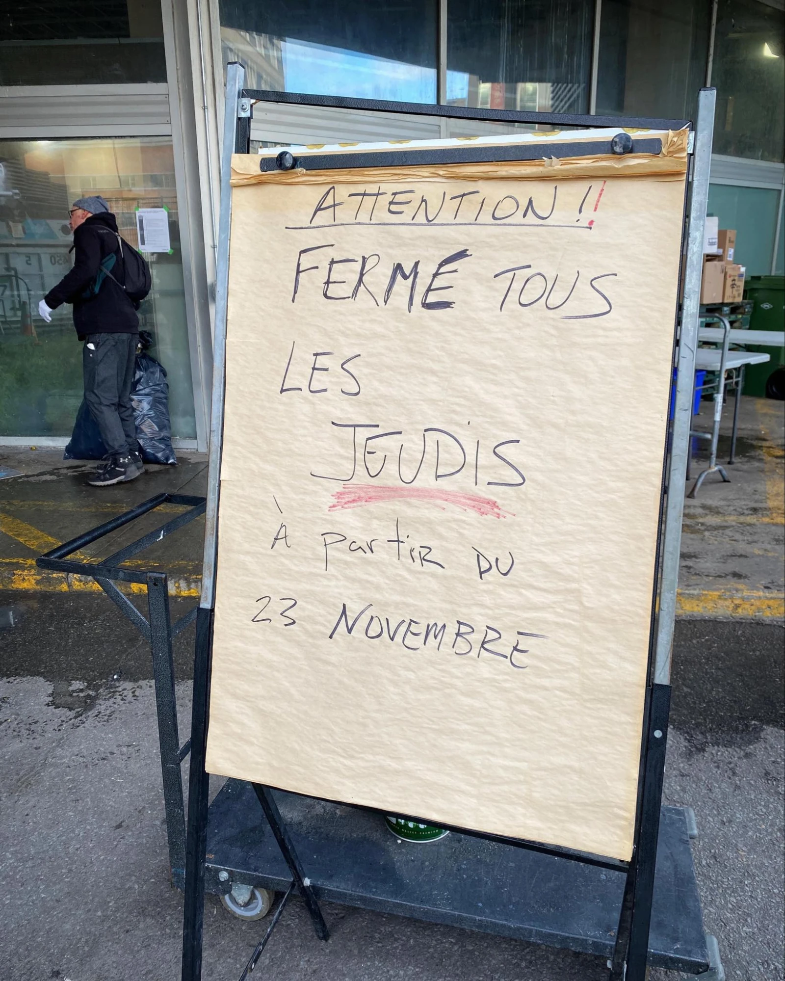 Dès mon arrivée, je remarque une pancarte à la porte de l’organisme qui annonce la réduction des heures d’opération. « Attention: fermé tous les jeudis à partir du 23 novembre ».