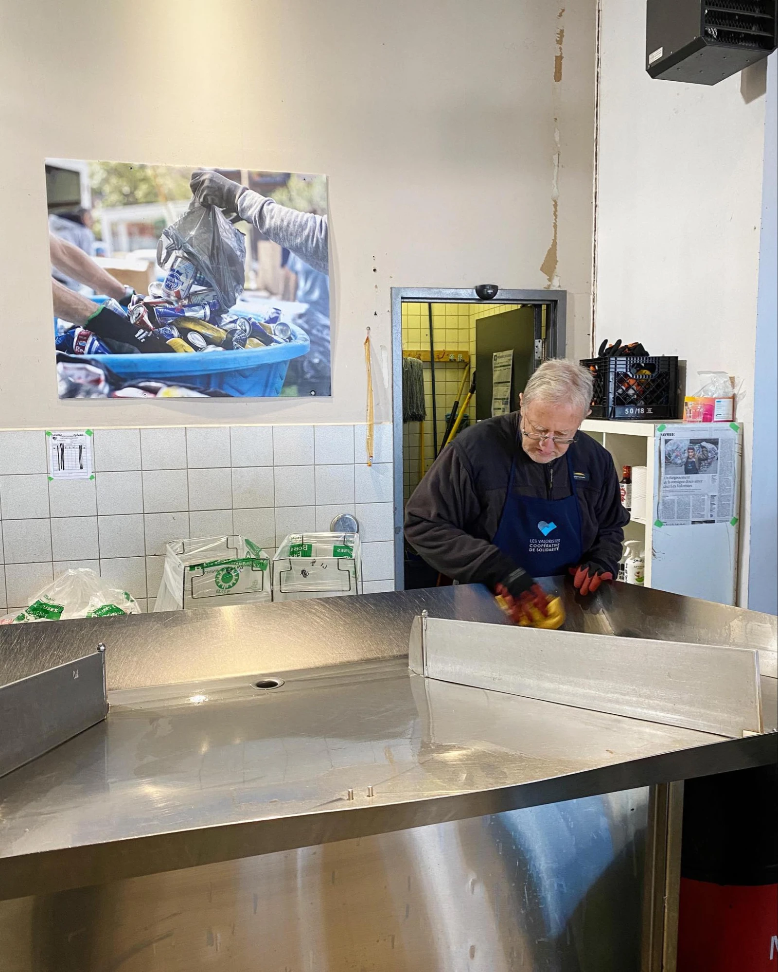 C’est encore l’heure du café, mais l’odeur du houblon prend au nez et le plancher est déjà un peu collant. Rien pour réfreiner l’entrain des employés et bénévoles, qui remettent des factures aux valoristes pour leur permettre d’encaisser à un petit guichet le fruit de leur labeur matinal. Au milieu du staff qui s’affaire autour des cannettes, je reconnais la bénévole et valoriste au grand cœur Thérèse Duval, 66 ans, qui ramasse des bouteilles depuis six ans pour remettre la totalité de l’argent à des organismes de bienfaisance.
