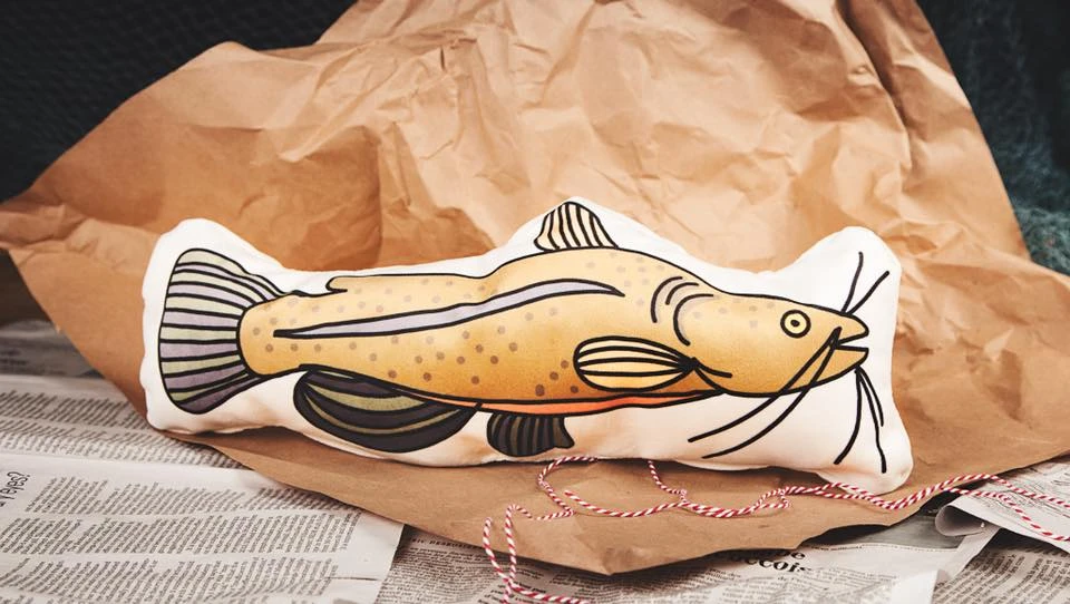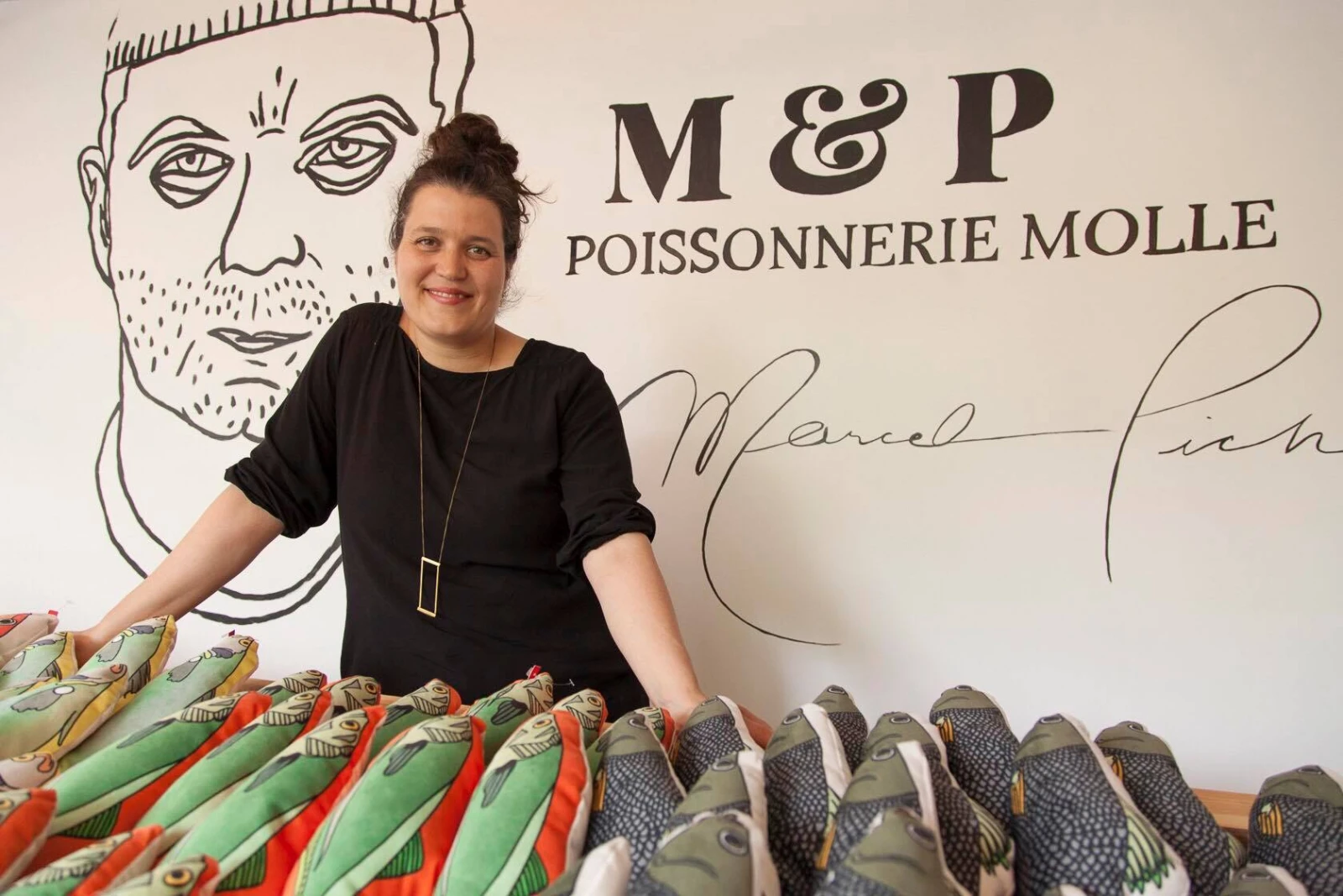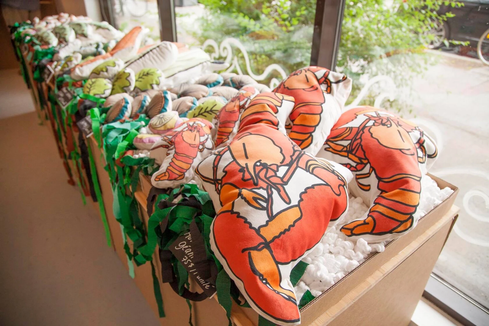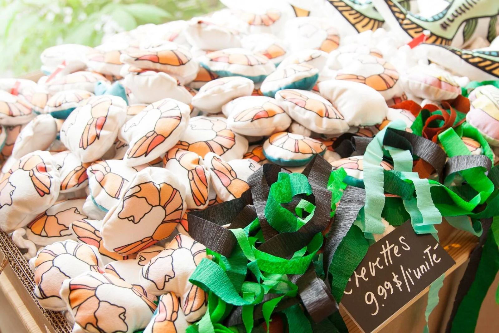 La boutique a complètement été transformée en poissonnerie, on y vend maintenant exclusivement des coussins (ou des toutous) en forme de poissons et crustacés, dessinés de ma main. J’ai organisé plusieurs soirées de « fourrage » avec des amis pour la fabrication, on a des crevettes, des esturgeons, des brochets et d’autres espèces dans nos étalages! J’ai voulu créer une expérience immersive : on est dans une vraie poissonnerie!