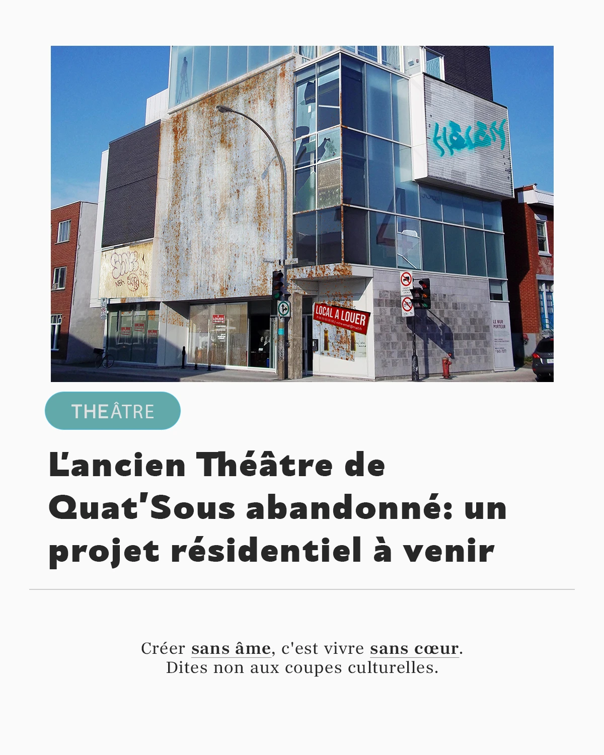 Vendredi dernier, ma collègue Andréanne m’a fait parvenir une publication Facebook d’un certain Francis-William Rhéaume affirmant que le Théâtre de Quat’Sous venait d’être abandonné et serait éventuellement remplacé par un immeuble à logements.