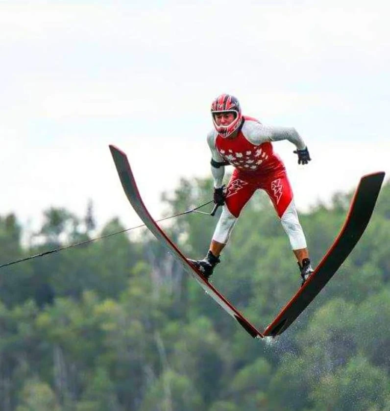 J’ai rencontré Alex Paradis, skieur nautique professionnel parcourant le monde pour pratiquer son sport à temps plein et passant certains hivers en Floride pour s’entraîner. Alex, 30 ans, a fait ses griffes dans ce sport extrême tout en poursuivant des études de maîtrise en administration des affaires. Il me rappelle que la grande différence par rapport au ski sur neige se trouve dans la traction nécessaire sur l’eau alors qu’en montagne, on est propulsé par la gravité.